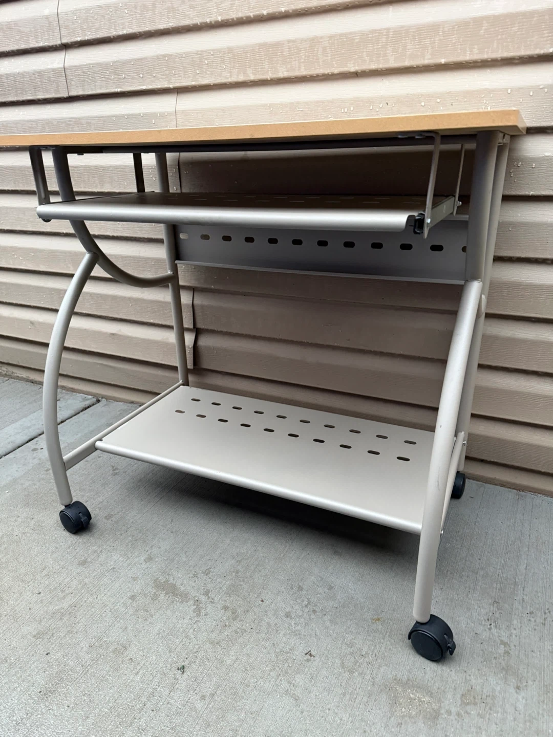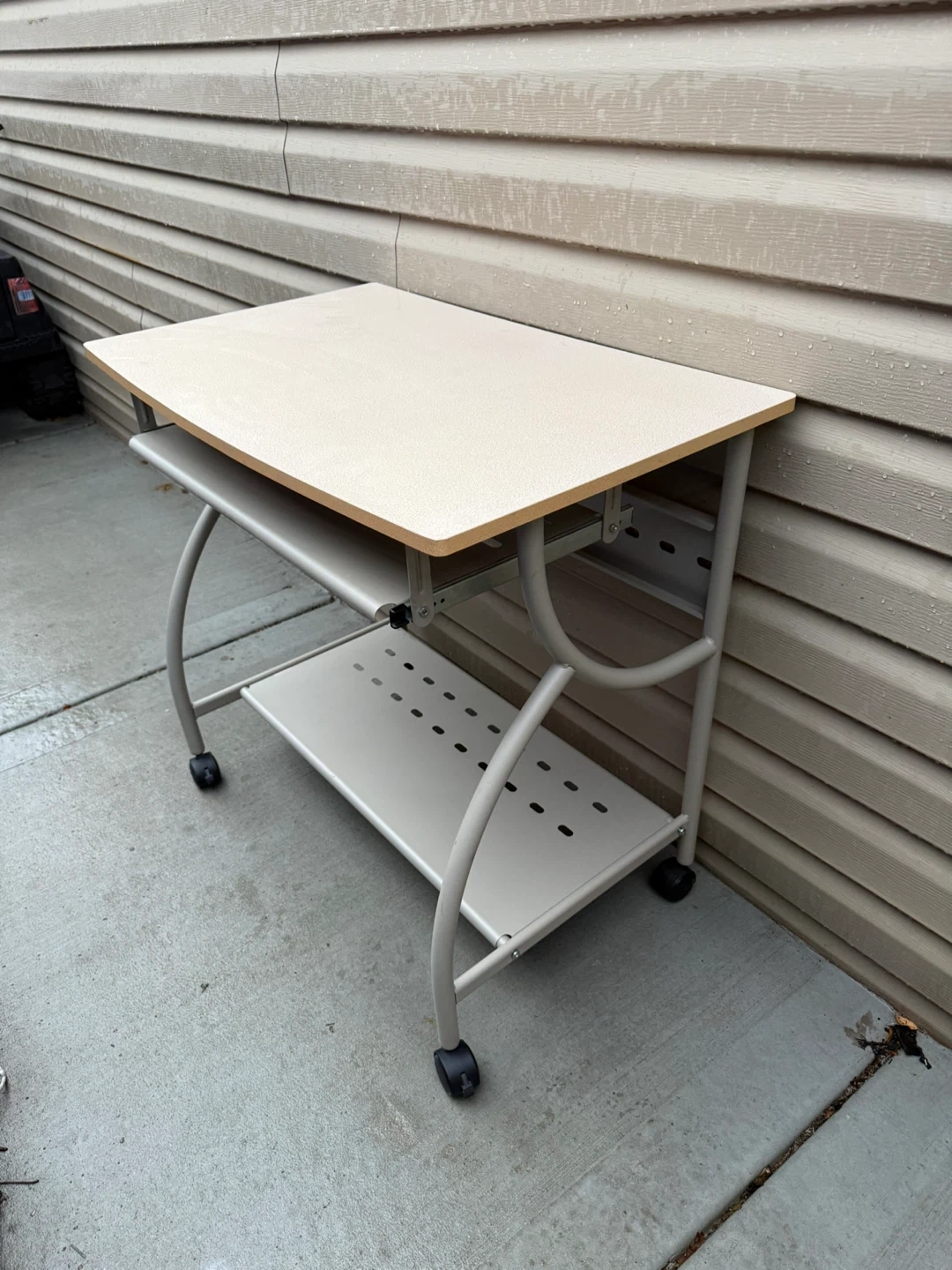 Selling a rolling computer desk, perfect for small spaces! It features a pull-out keyboard tray and a lower shelf for storage. The desk has a neutral color scheme that would fit well in any room. It's in good condition and ready to use