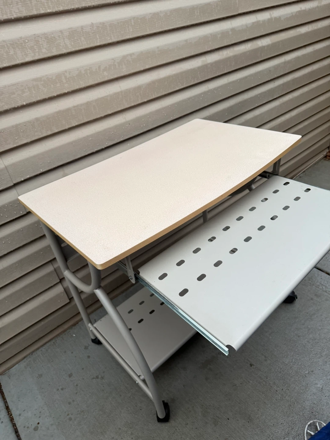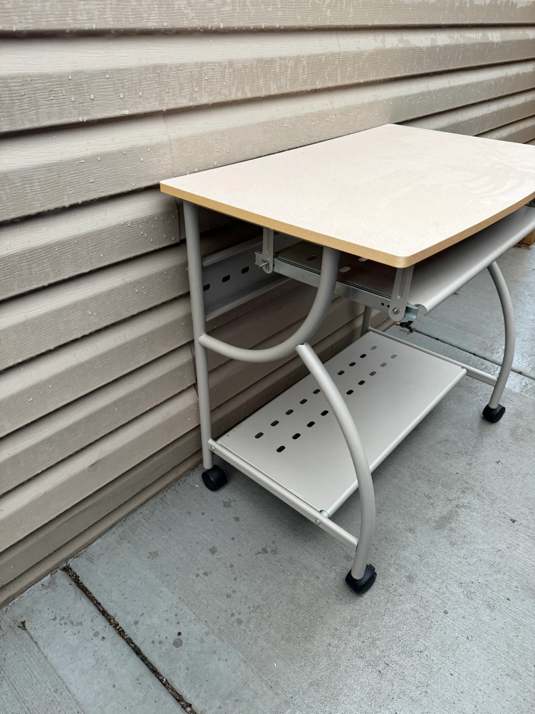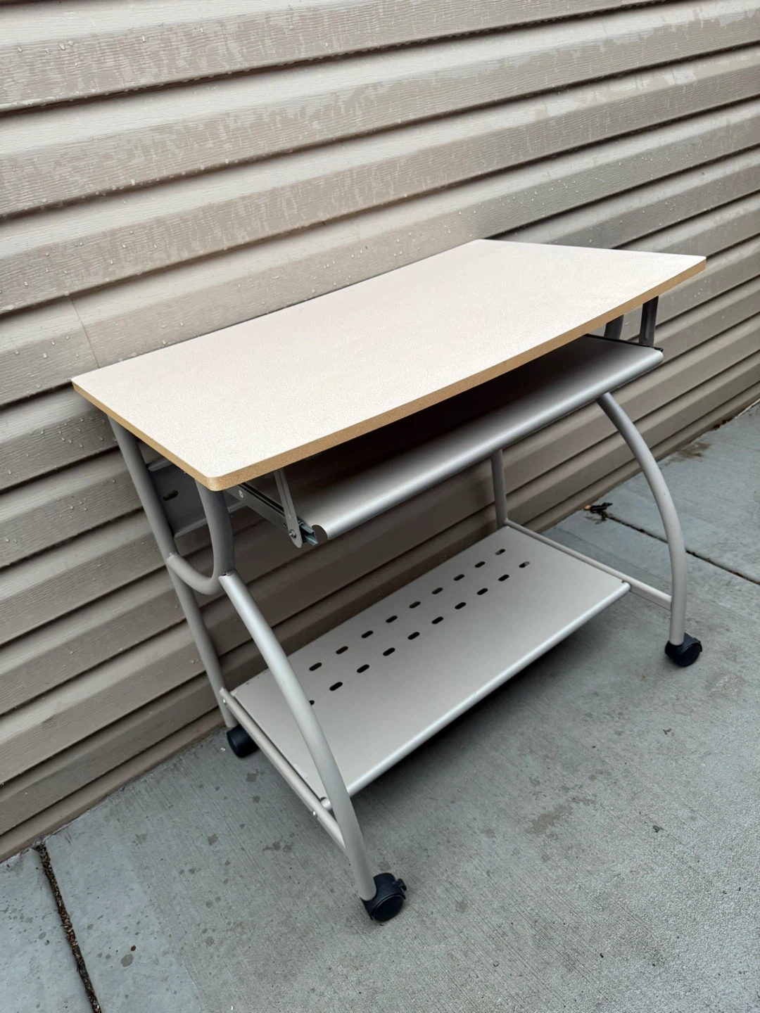 Selling a rolling computer desk, perfect for small spaces! It features a pull-out keyboard tray and a lower shelf for storage. The desk has a neutral color scheme that would fit well in any room. It's in good condition and ready to use
