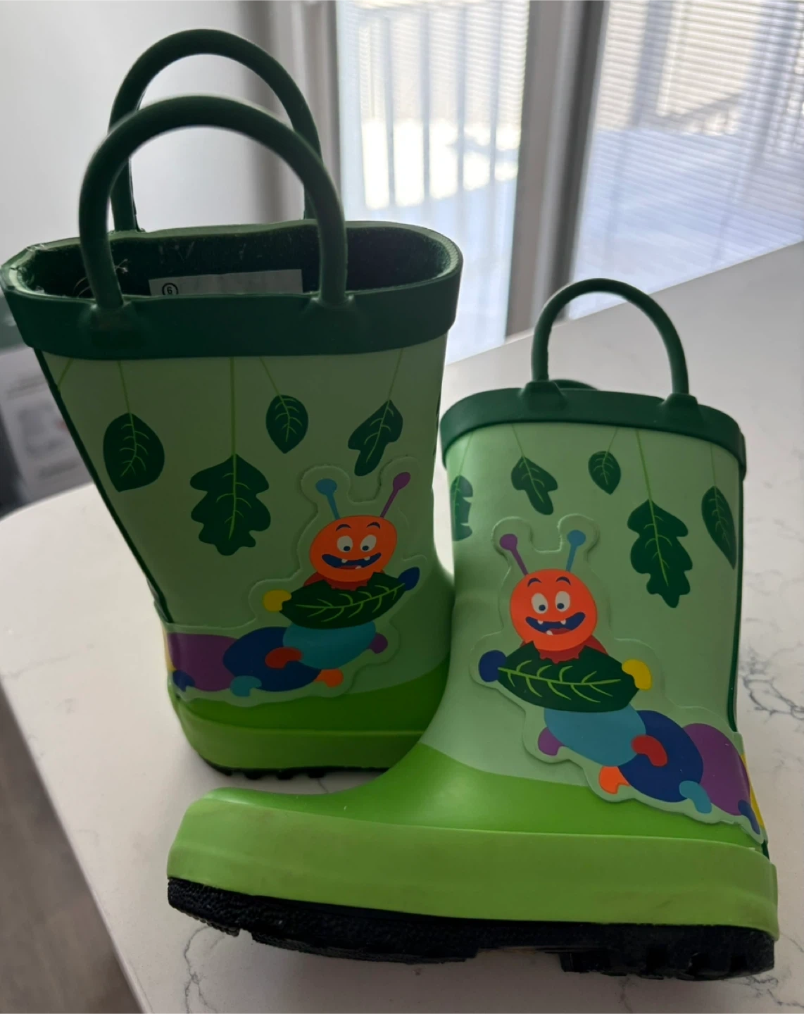 These cute green rain boots feature a playful caterpillar design and leaf accents. They're made from waterproof material, perfect for puddle jumping. The pull-on handles make them easy for little ones to put on themselves. Size is 6.