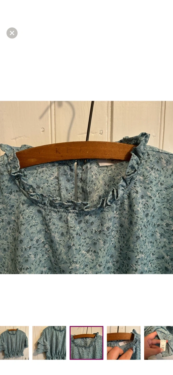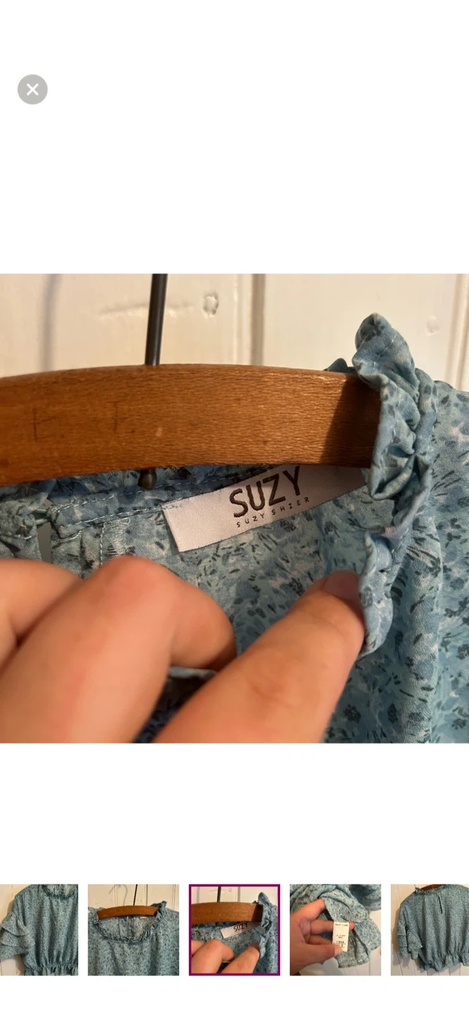 Suzy sheir brand. Short ruffle sleeve high neck blouse. Slightly cropped. Blue floral. Size medium. Brand new condition