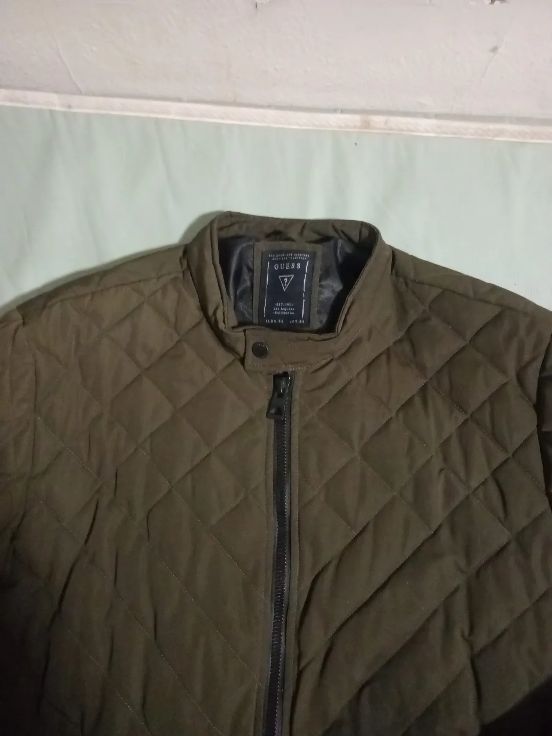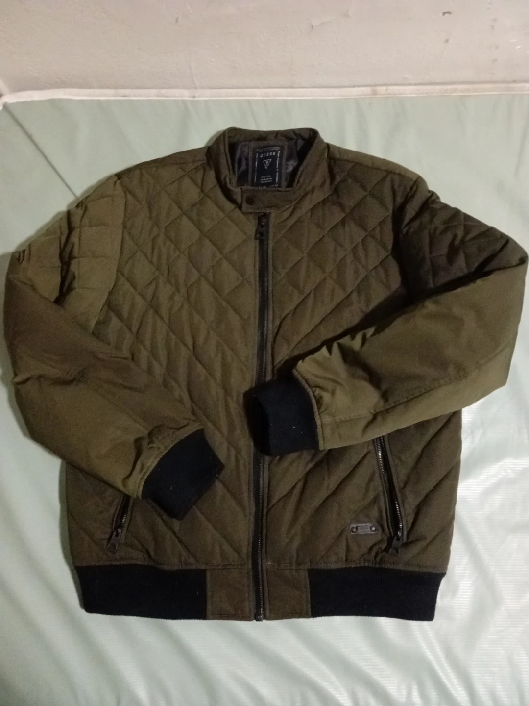 This is a Guess quilted bomber jacket. It's olive green with black trim and ribbed cuffs. It has a full zip front and zippered pockets.