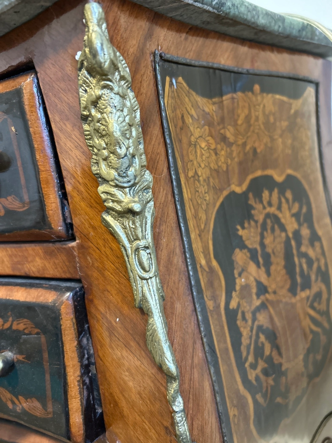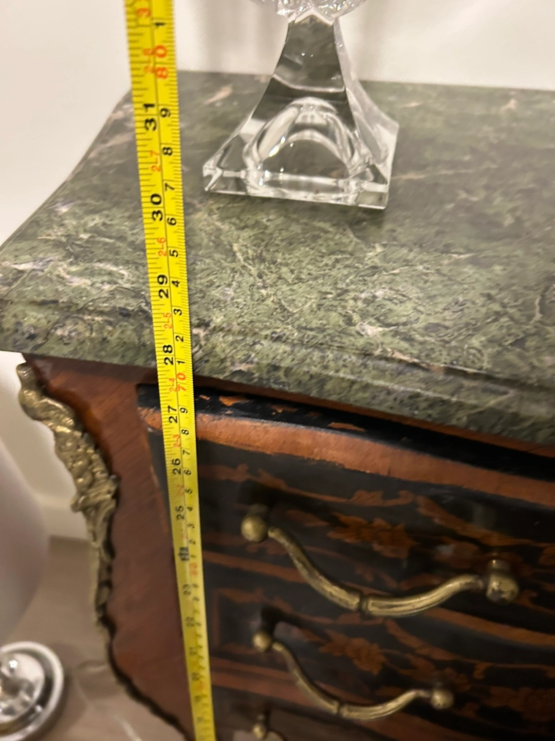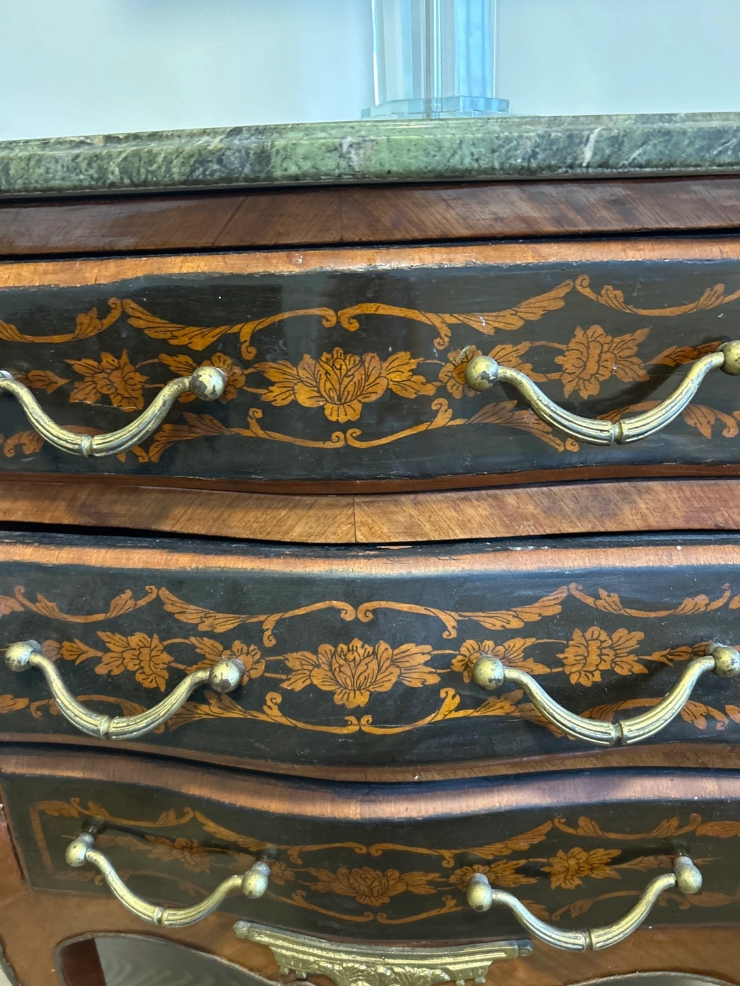 A beautiful antique chest of drawers featuring intricate marquetry inlay and ornate brass hardware. It has three drawers for storage and is topped with a green marble slab. This piece would make a striking accent in any room! 350$ obo