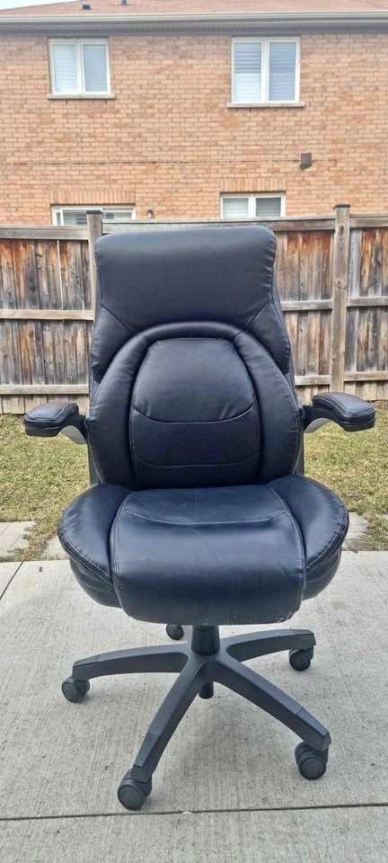Comfortable La-Z-Boy black executive office chair. Features adjustable height and armrests. On wheels for easy movement. Dimensions: 43.7-47.5 in height, 18.7-22.4 in seat height, 30.5 in width, 29.5 in depth.