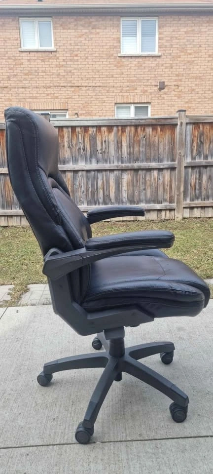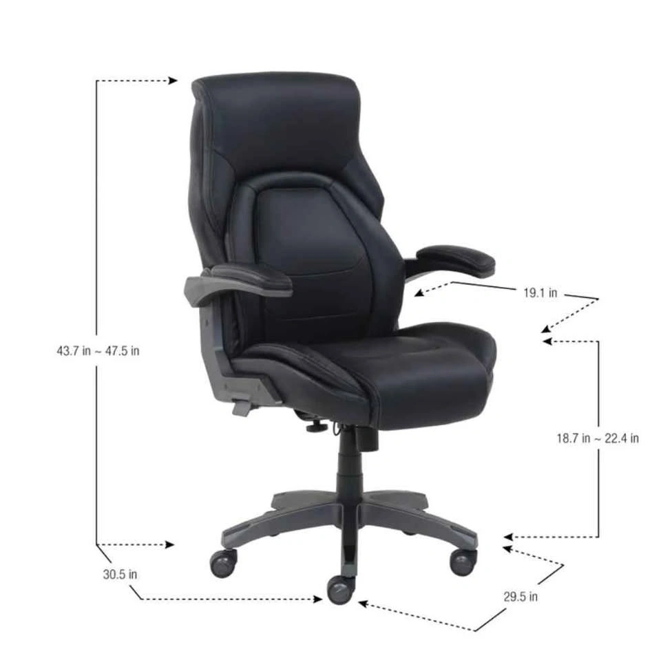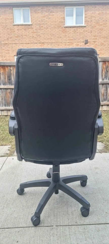 Comfortable La-Z-Boy black executive office chair. Features adjustable height and armrests. On wheels for easy movement. Dimensions: 43.7-47.5 in height, 18.7-22.4 in seat height, 30.5 in width, 29.5 in depth.
