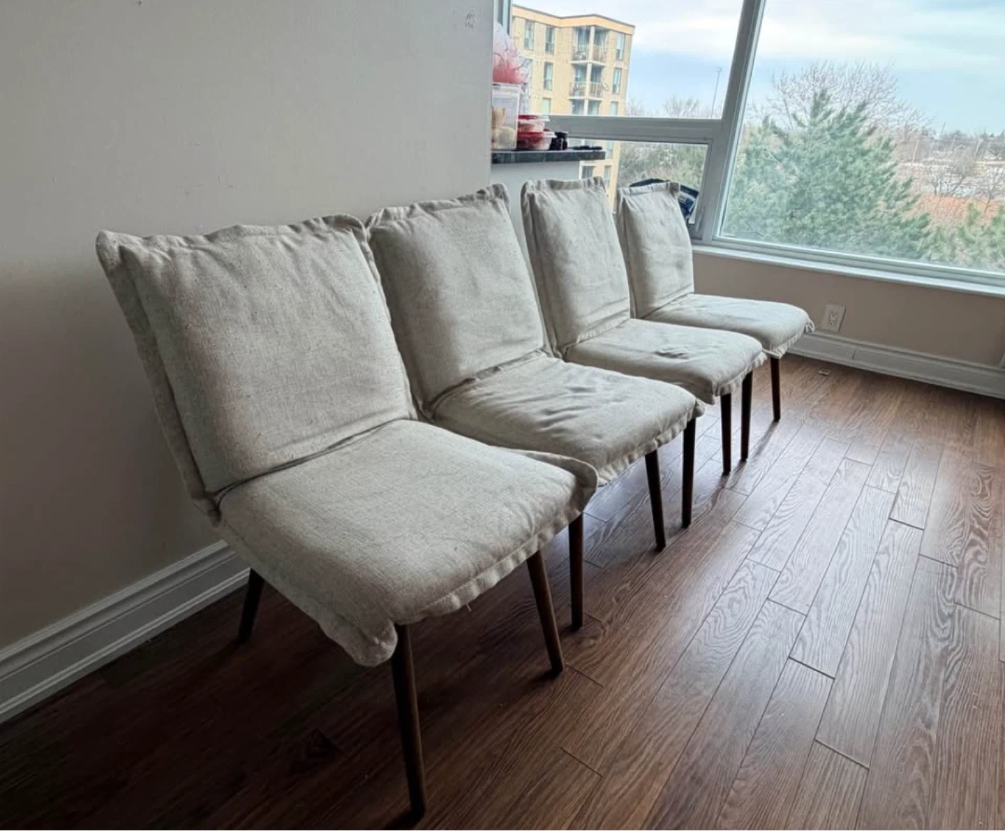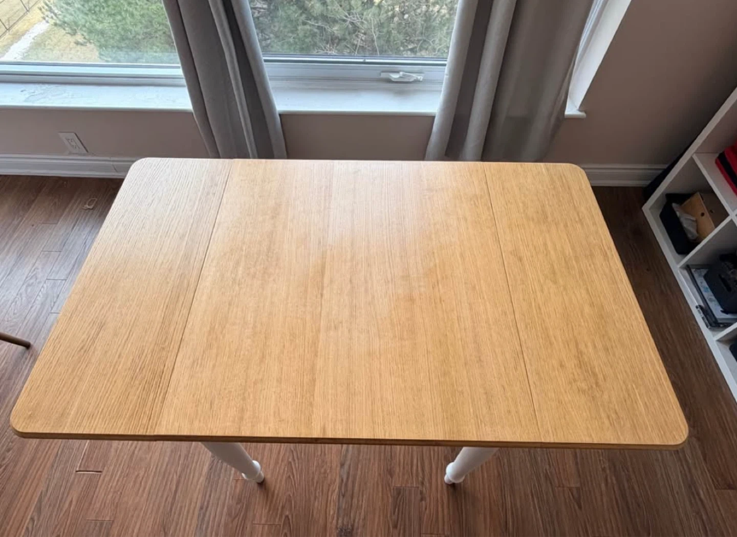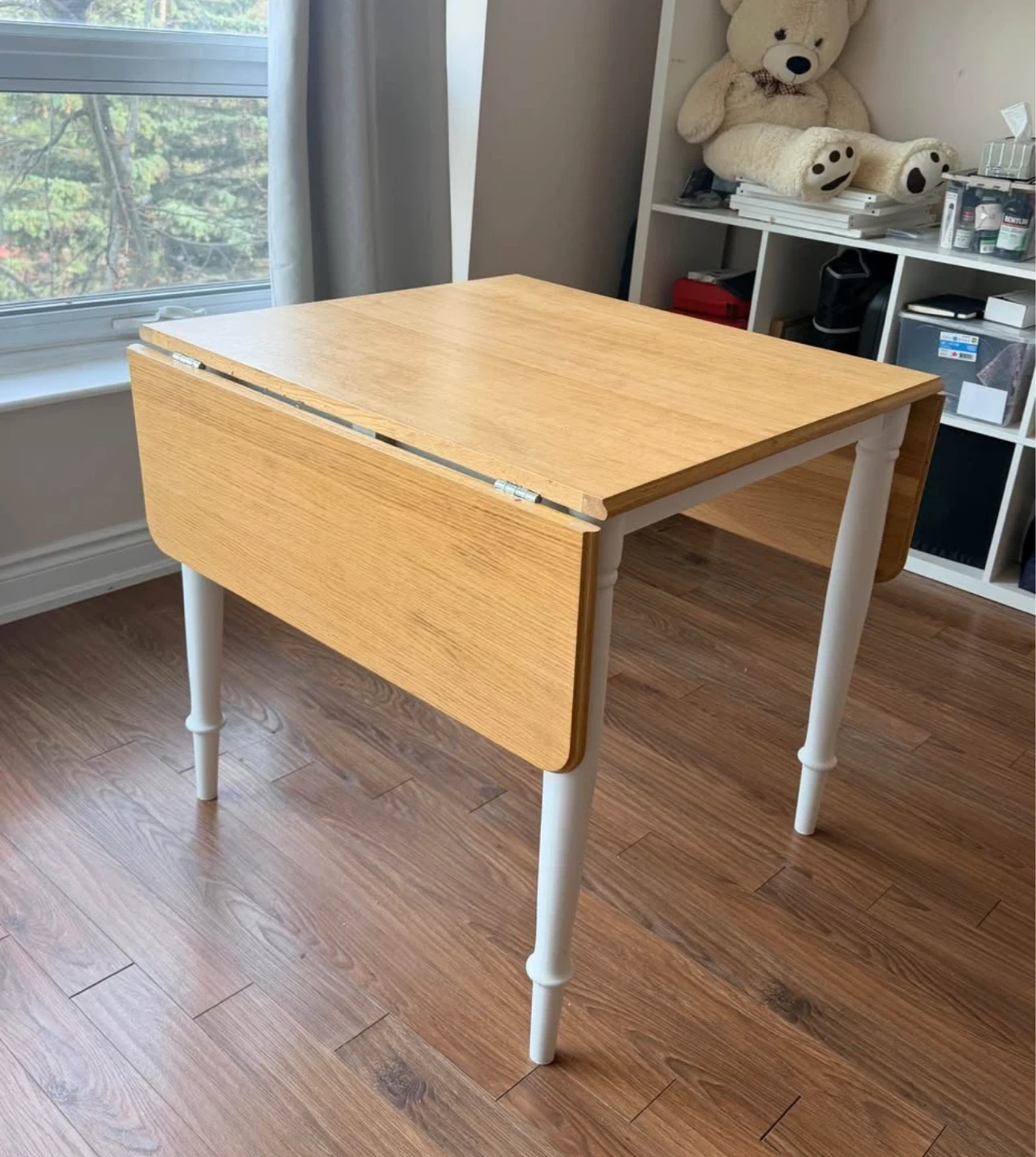 Versatile dining set. Drop-leaf table has light wood top and white base. Comes with 4 comfy chairs. Great for small spaces or when you need extra seating. And chairs cushion & covers removable and washable