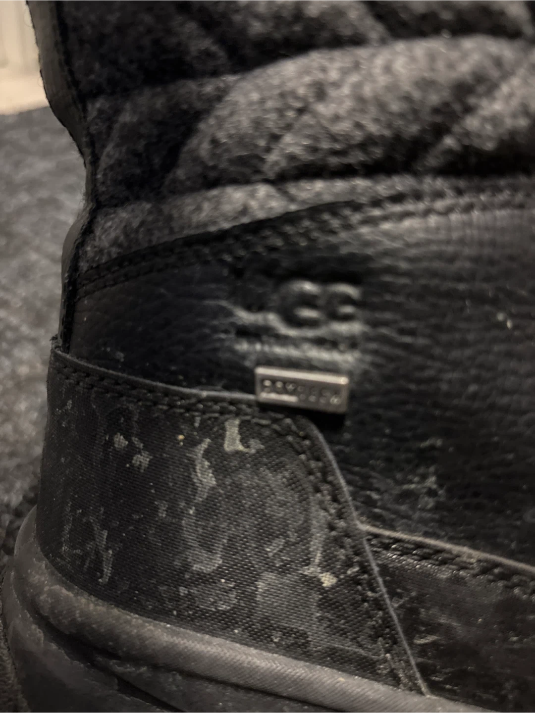 Black UGG winter boots with a mix of leather and quilted fabric. Features a waterproof design for cold weather protection. Cozy and warm for snowy days!