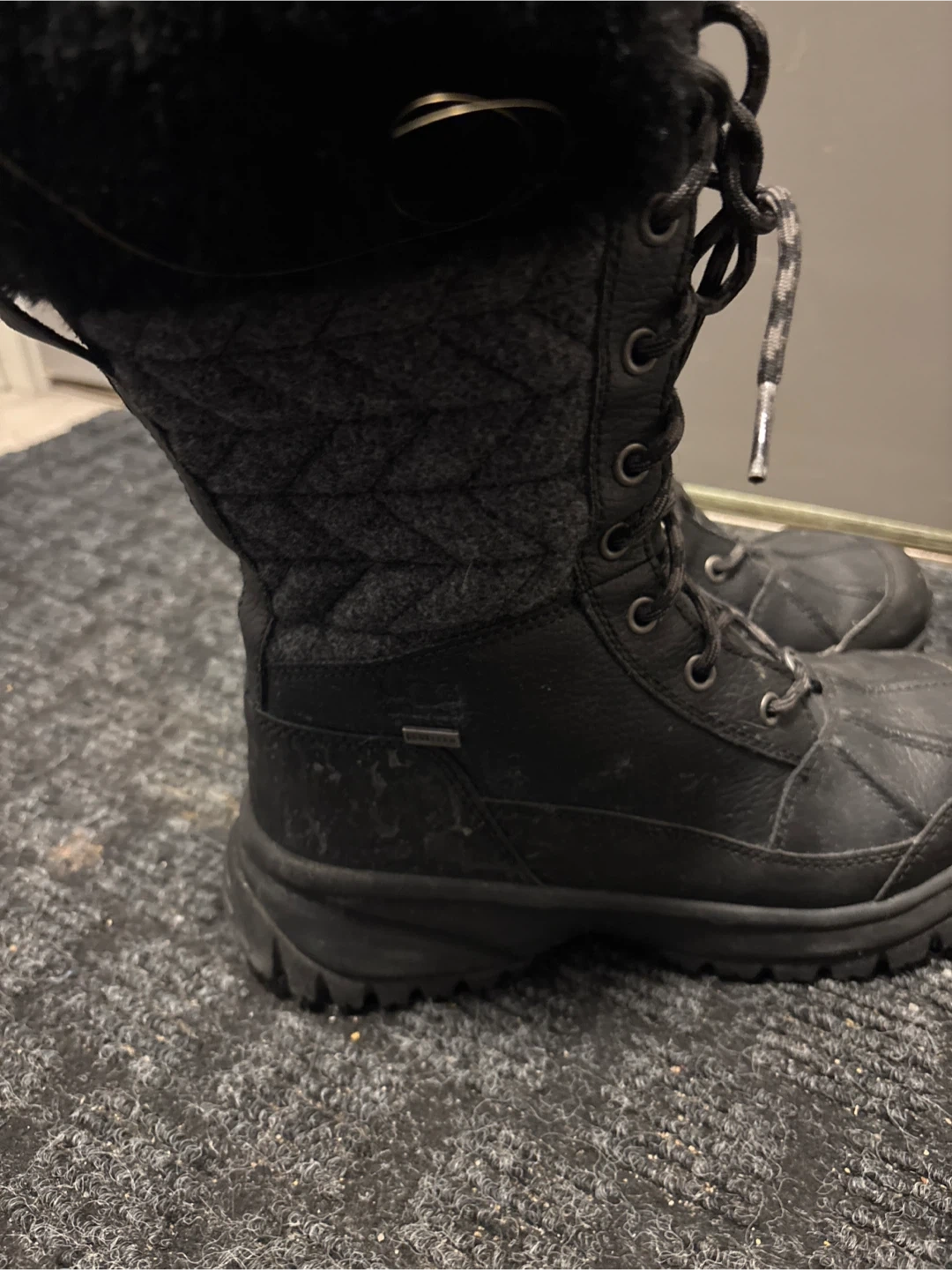 Black UGG winter boots with a mix of leather and quilted fabric. Features a waterproof design for cold weather protection. Cozy and warm for snowy days!