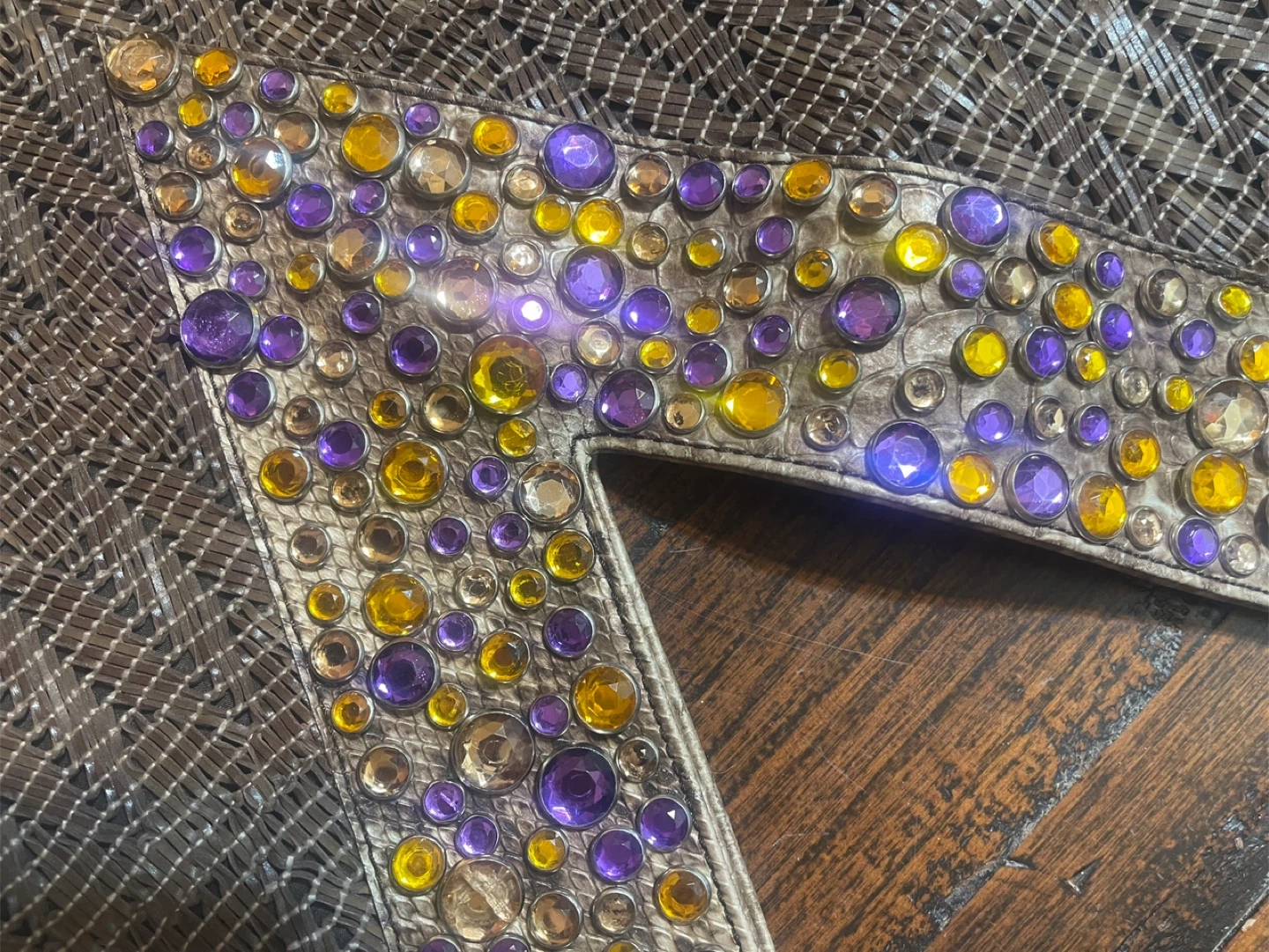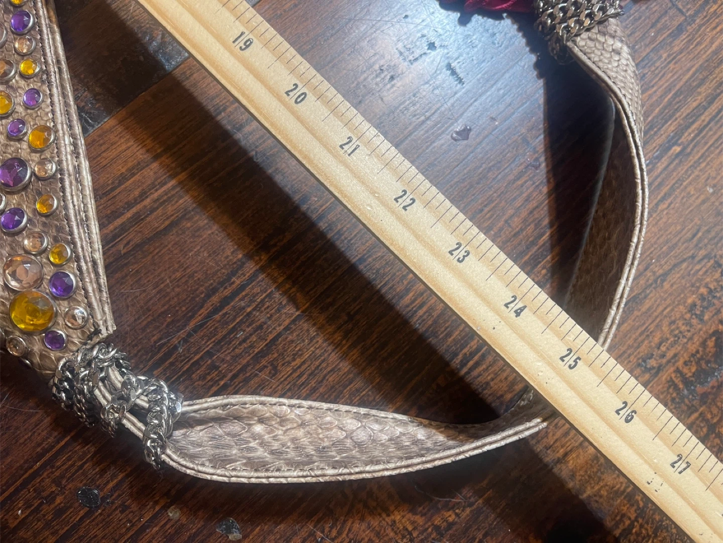 The standout detail is the wide V-shaped strap, embellished with purple, amber, and clear jewel accents, giving the bag a bold Y2K, boho, and artistic aesthetic. The strap also includes silver-tone chain accents and faux snakeskin texture for an elevated, eclectic look.