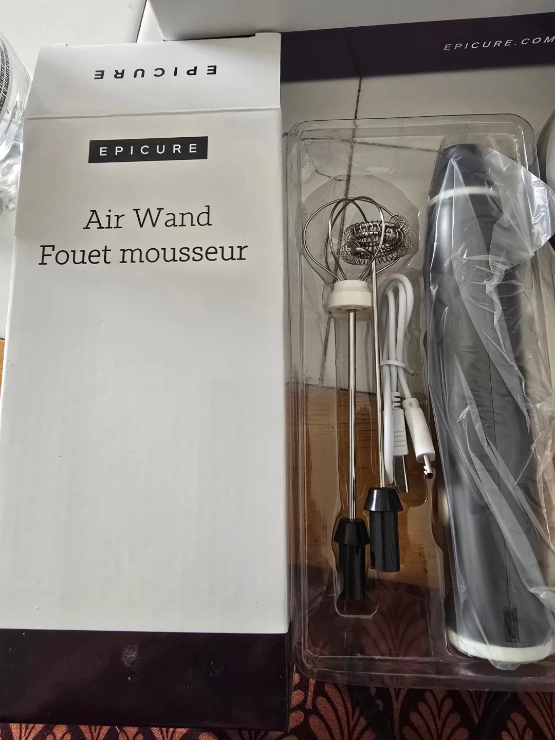 Epicure Air Wand for making frothy drinks. It includes the wand and a whisk attachment. USB charging cable is also included.