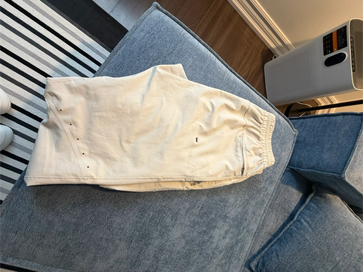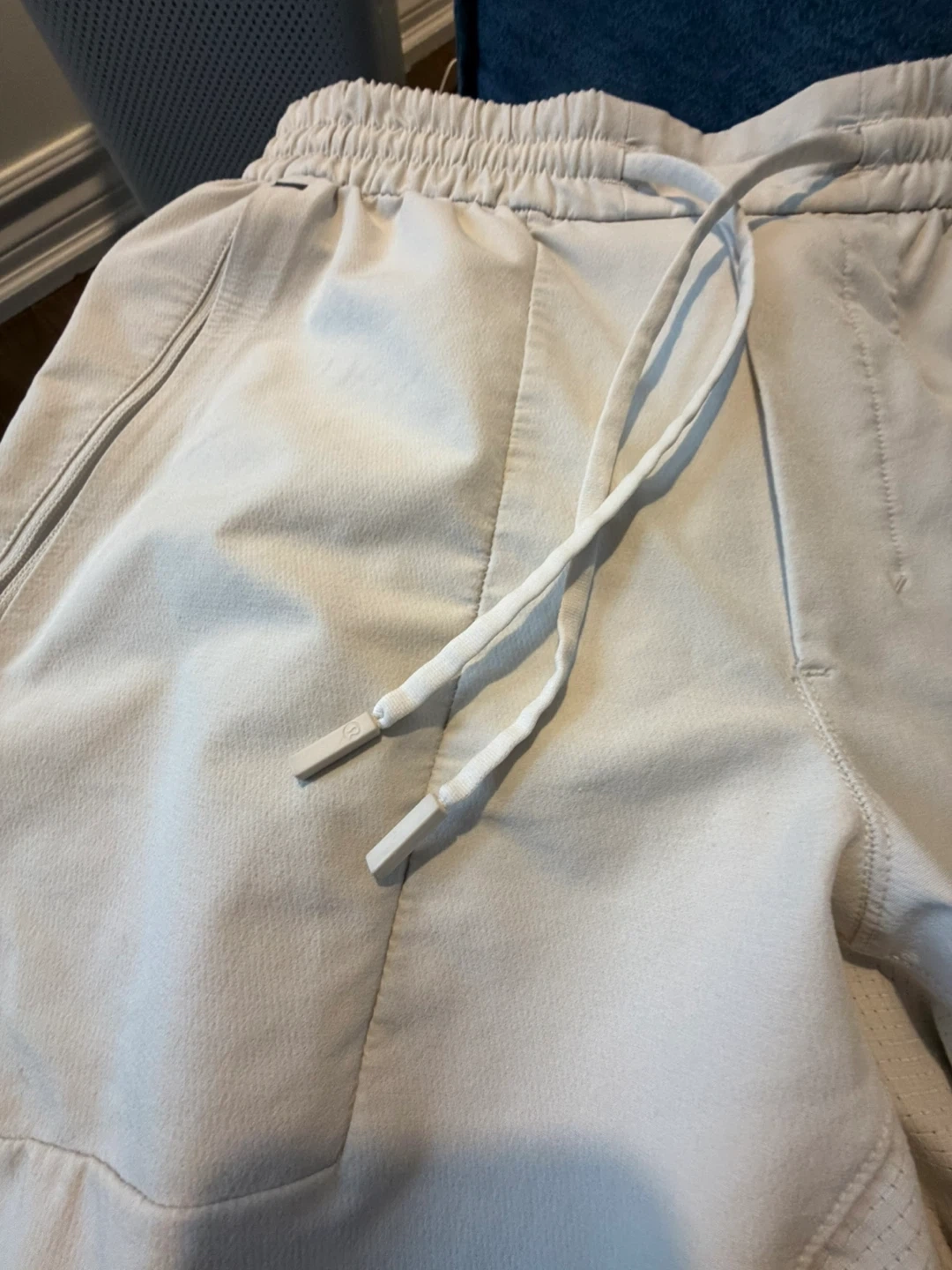 These Lululemon pants are a light beige colour. They feature an elastic waistband with a drawstring and pockets. They're made from a comfortable material.
