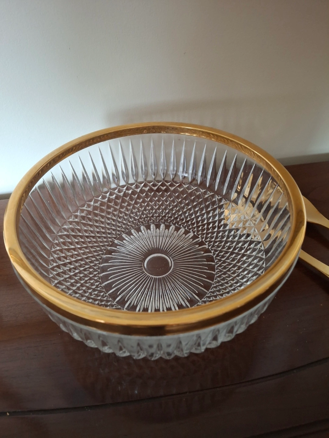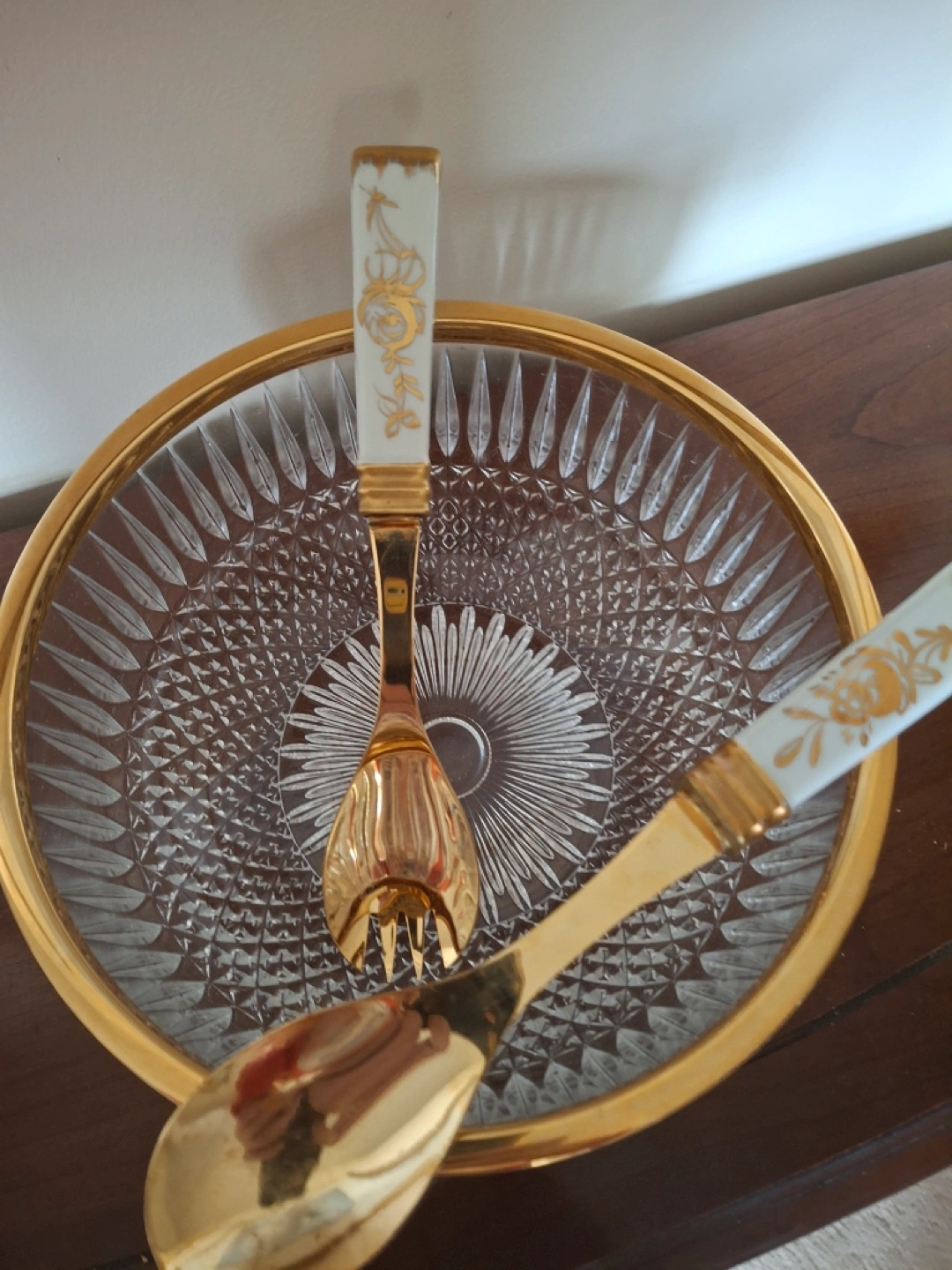 Crystal bowl with gold trim & salad servers