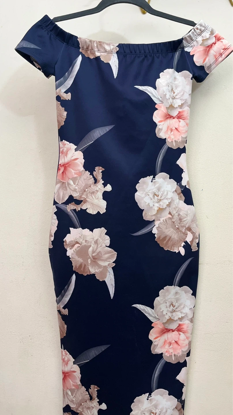 This navy bodycon dress features a beautiful floral print with pink and white flowers. It's an off-the-shoulder design with short sleeves. Stretchy material.
