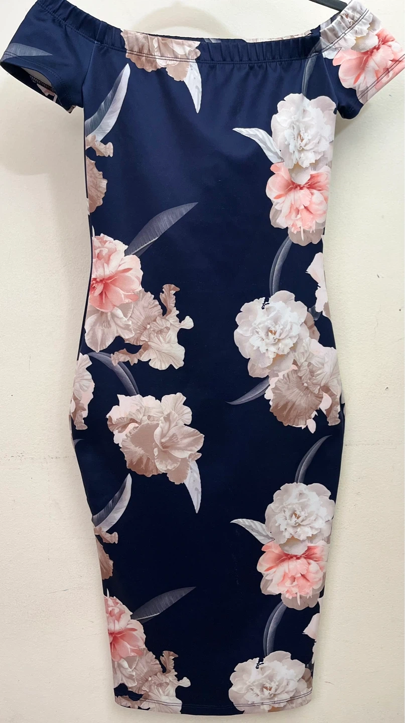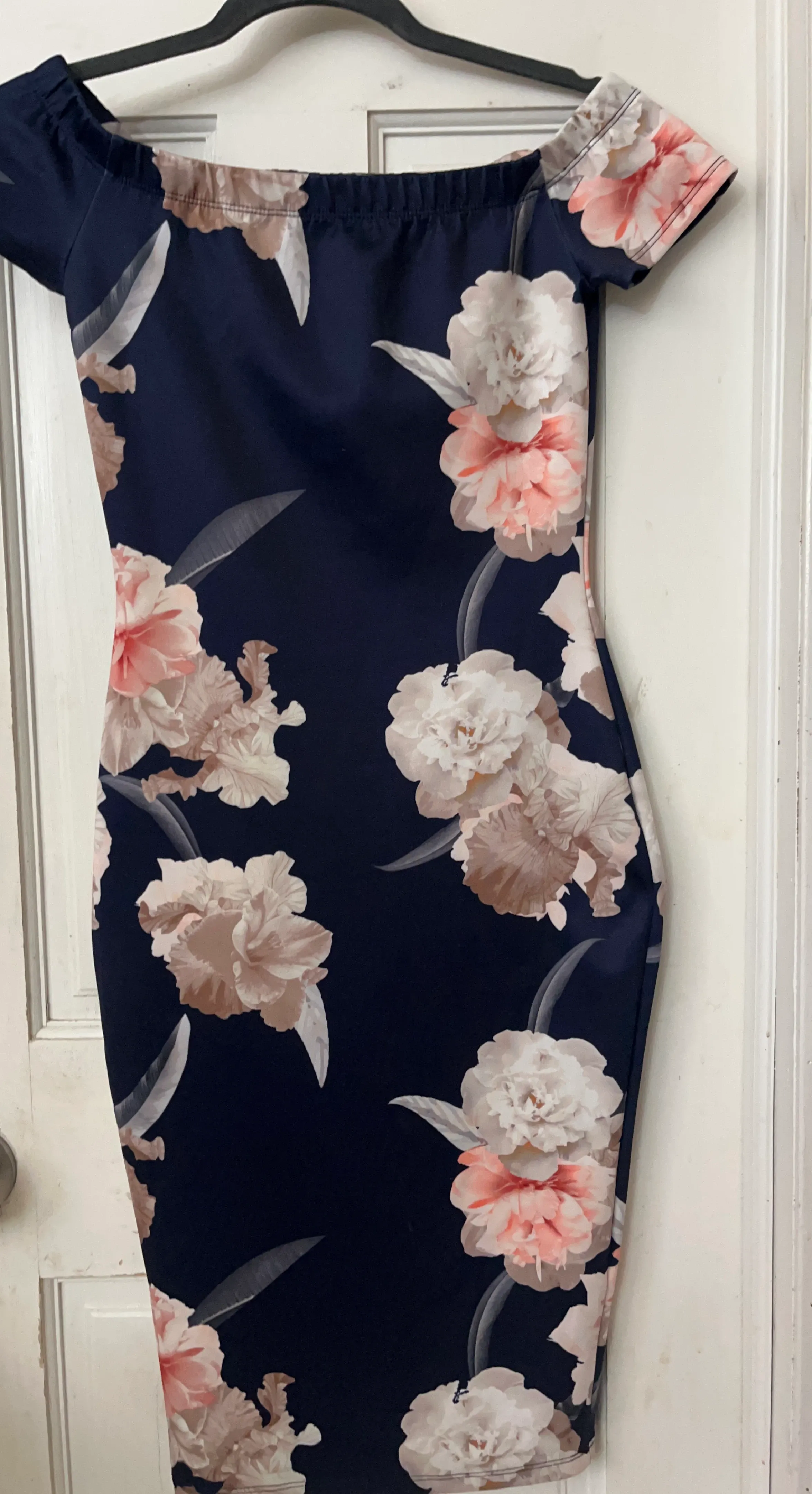 This navy bodycon dress features a beautiful floral print with pink and white flowers. It's an off-the-shoulder design with short sleeves. Stretchy material.