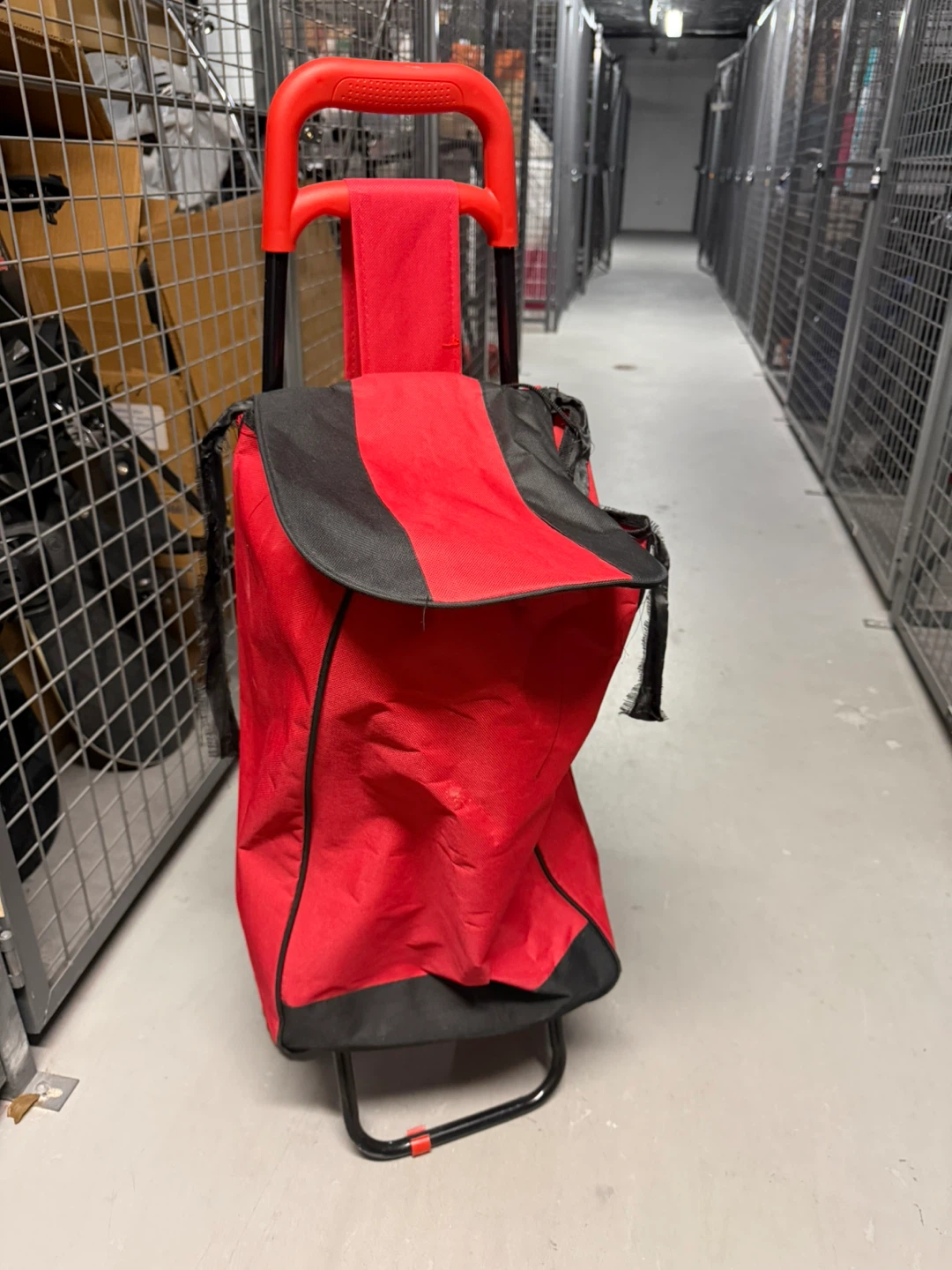 Selling a red and black wheeled shopping cart. It's in good condition and ready to help with your grocery runs or trips to the market. The wheels make it easy to maneuver, and the bag is spacious enough for a good amount of items