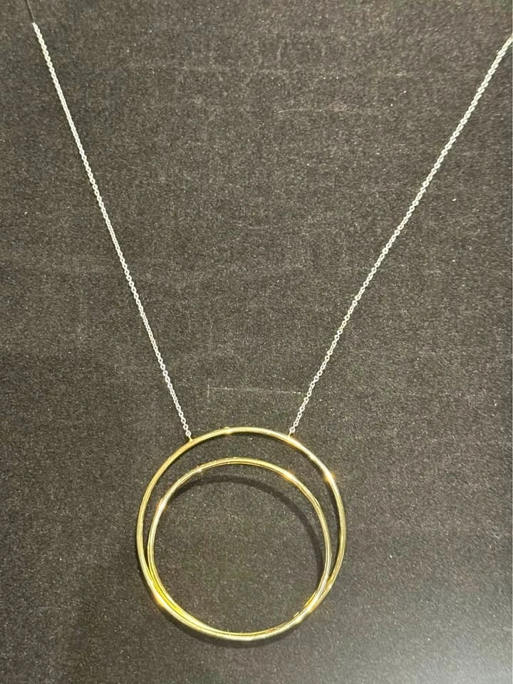 Stylish necklace with a delicate silver chain. Has a cool pendant with two interlocking gold-tone circles. Chain is sterling silver (925 mark). Adjustable length too. Does not come in a box. There is a gift with purchase ☺️