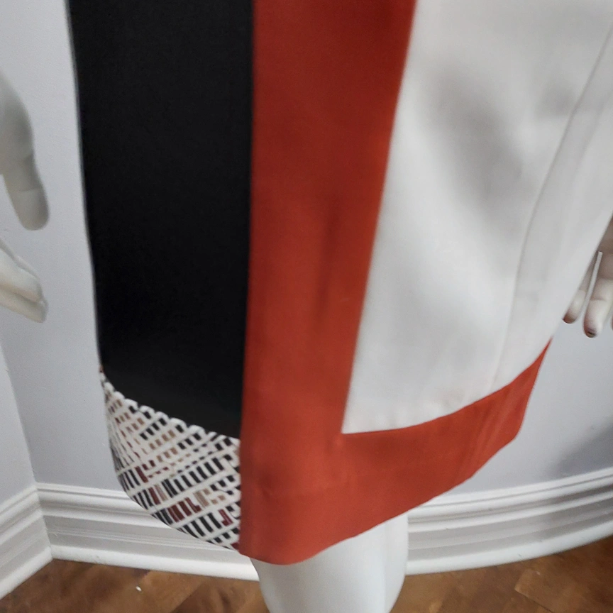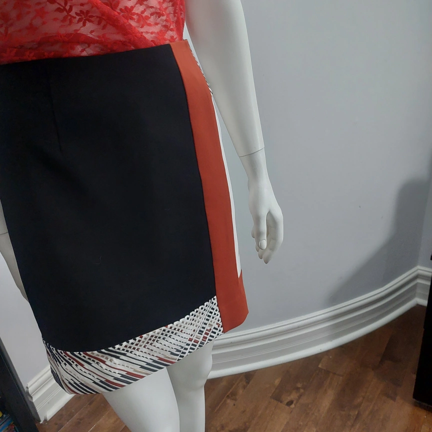 Beautiful White House Black Market skirt in size 00. It features a unique colour block design with black, white, and rust-coloured panels. The skirt is in great condition and would be a stylish addition to your wardrobe!