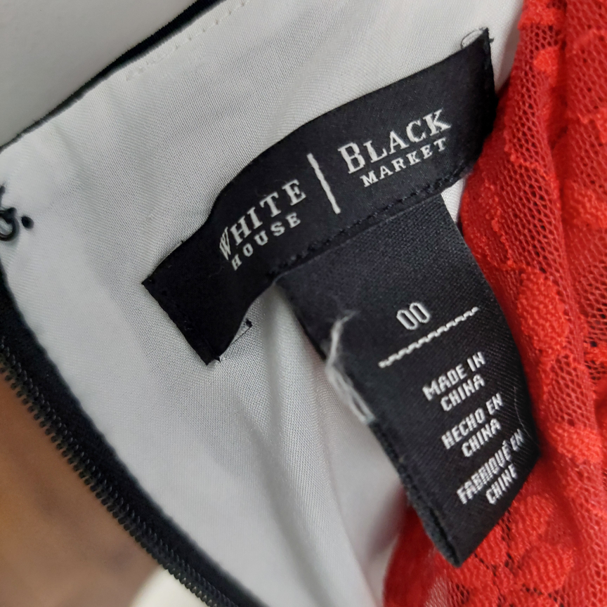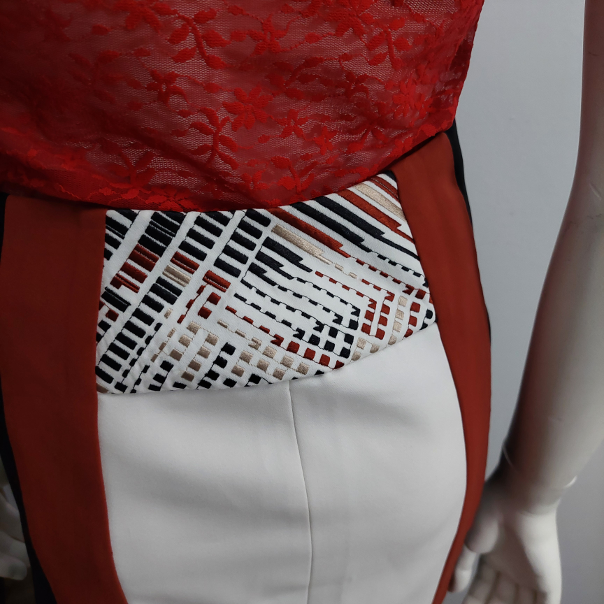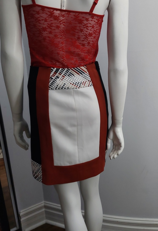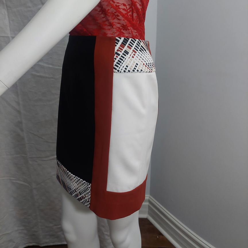 Beautiful White House Black Market skirt in size 00. It features a unique colour block design with black, white, and rust-coloured panels. The skirt is in great condition and would be a stylish addition to your wardrobe!