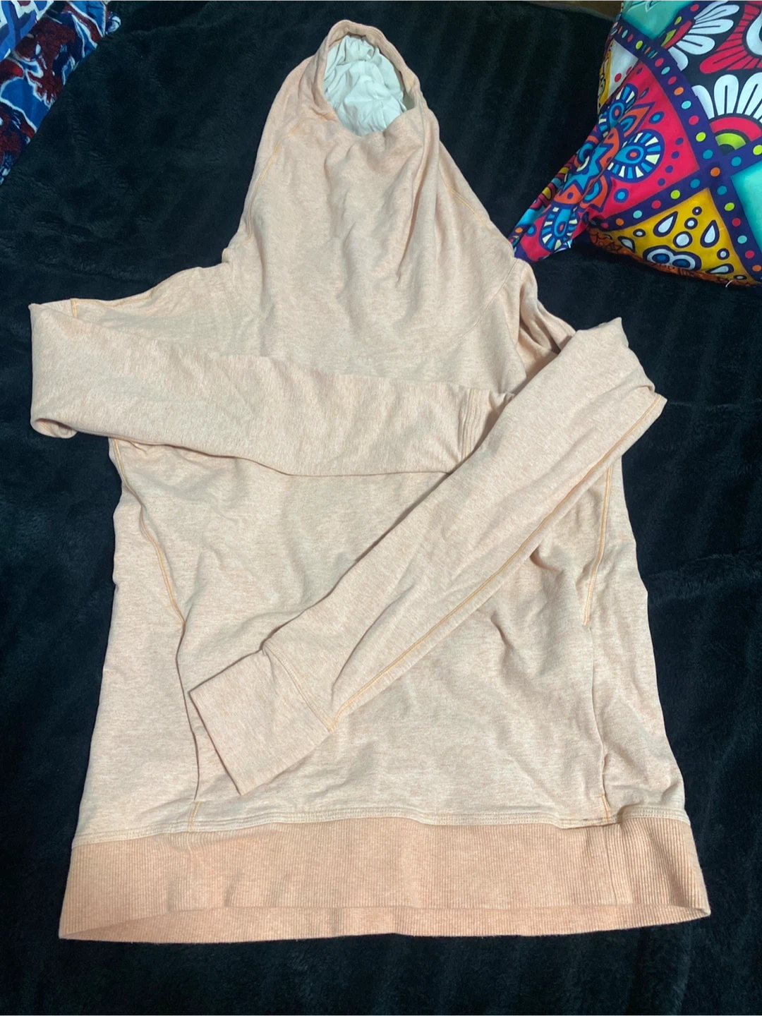 This is a soft, peach-coloured hoodie. It has a cosy cowl neck and long sleeves. The fabric is a comfortable cotton blend, perfect for casual wear.pick up cash only