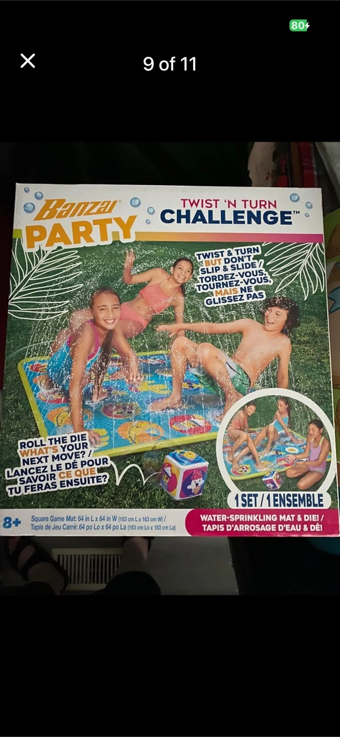 This Banzai Party Twist 'n Turn Challenge set includes a water-sprinkling mat and a die. The square game mat measures 64 inches by 64 inches. It's designed for outdoor fun and is recommended for ages 8 and up!