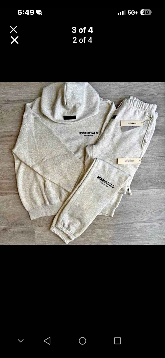 This is an ESSENTIALS by Fear of God hoodie and sweatpants set in a light grey colour. It's made from a comfortable material. The set is great for casual wear.