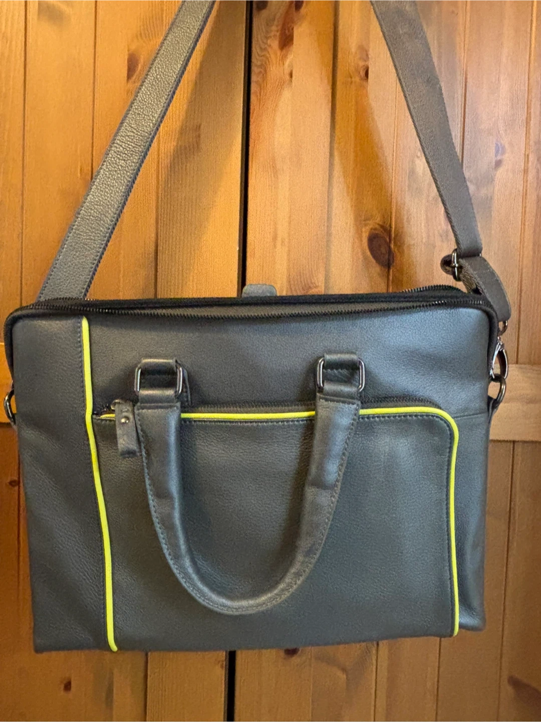 This is a stylish laptop bag. It's made of genuine leather and includes a detachable shoulder strap. This bag is perfect for carrying your laptop and essentials to work or school. Unisex.