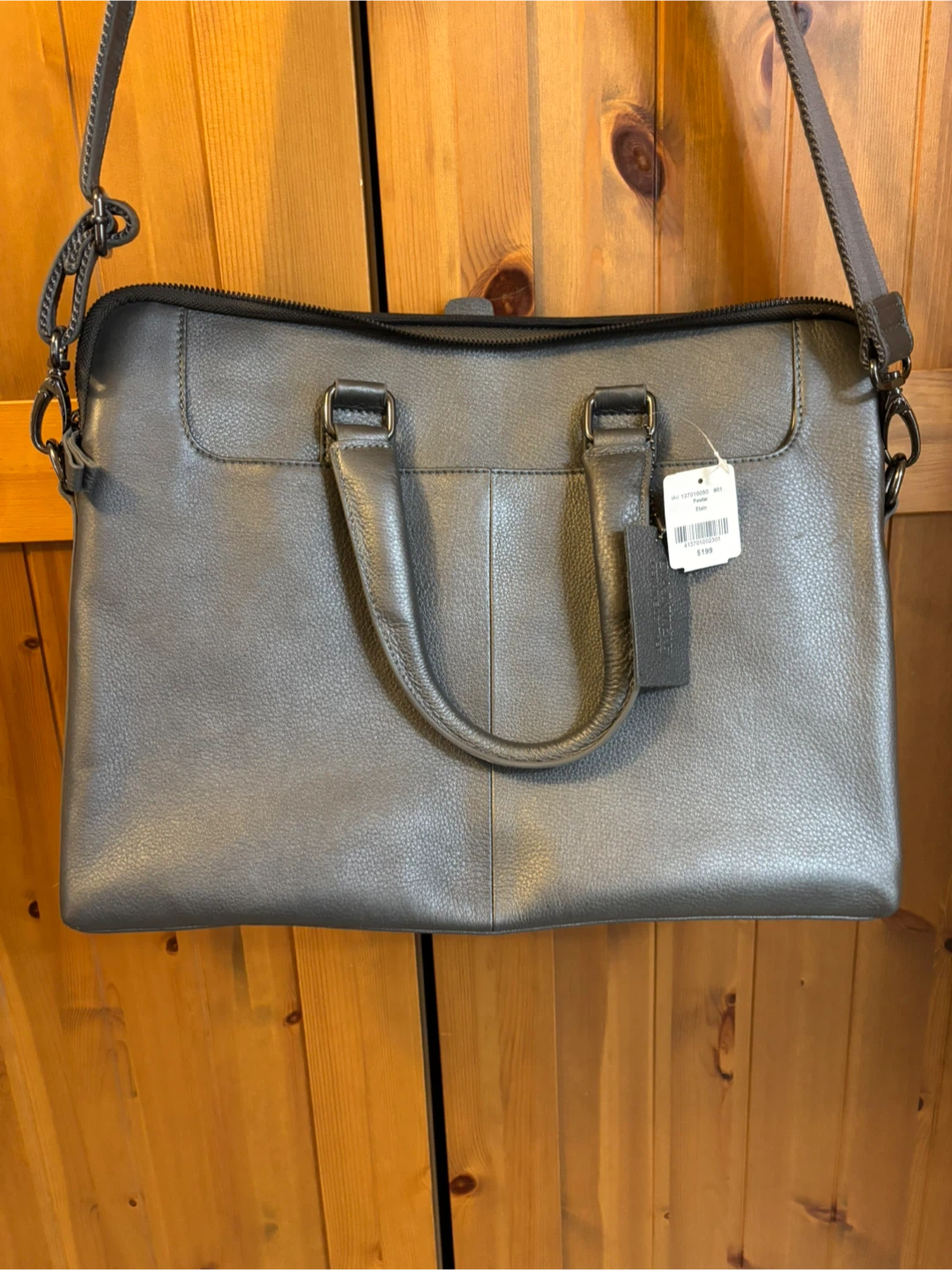This is a stylish laptop bag. It's made of genuine leather and includes a detachable shoulder strap. This bag is perfect for carrying your laptop and essentials to work or school. Unisex.