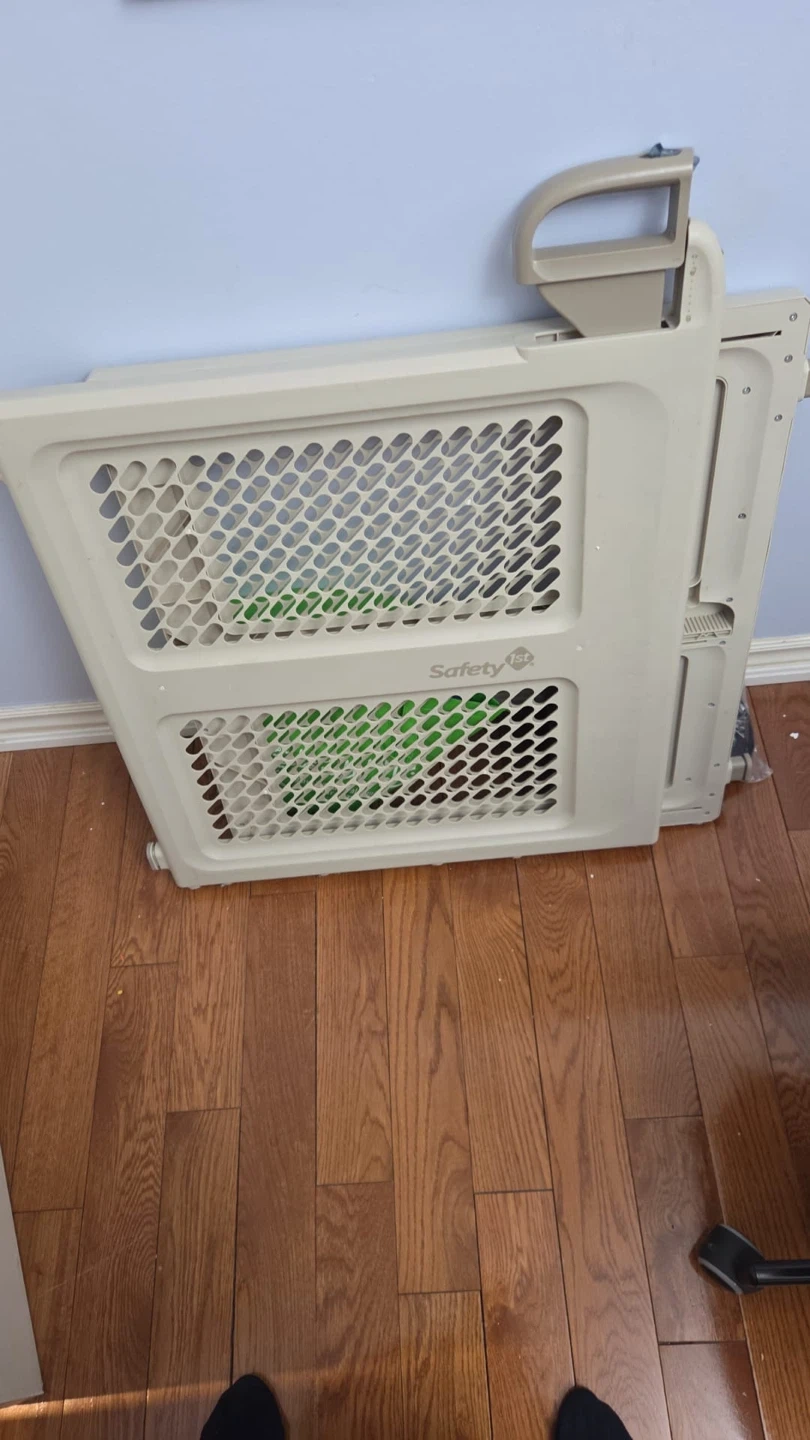 This is a Safety 1st baby gate in beige. It features a swing-to-close latch and a walk-through design. It's made of durable plastic and is great for keeping little ones safe.
