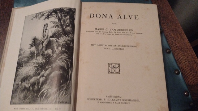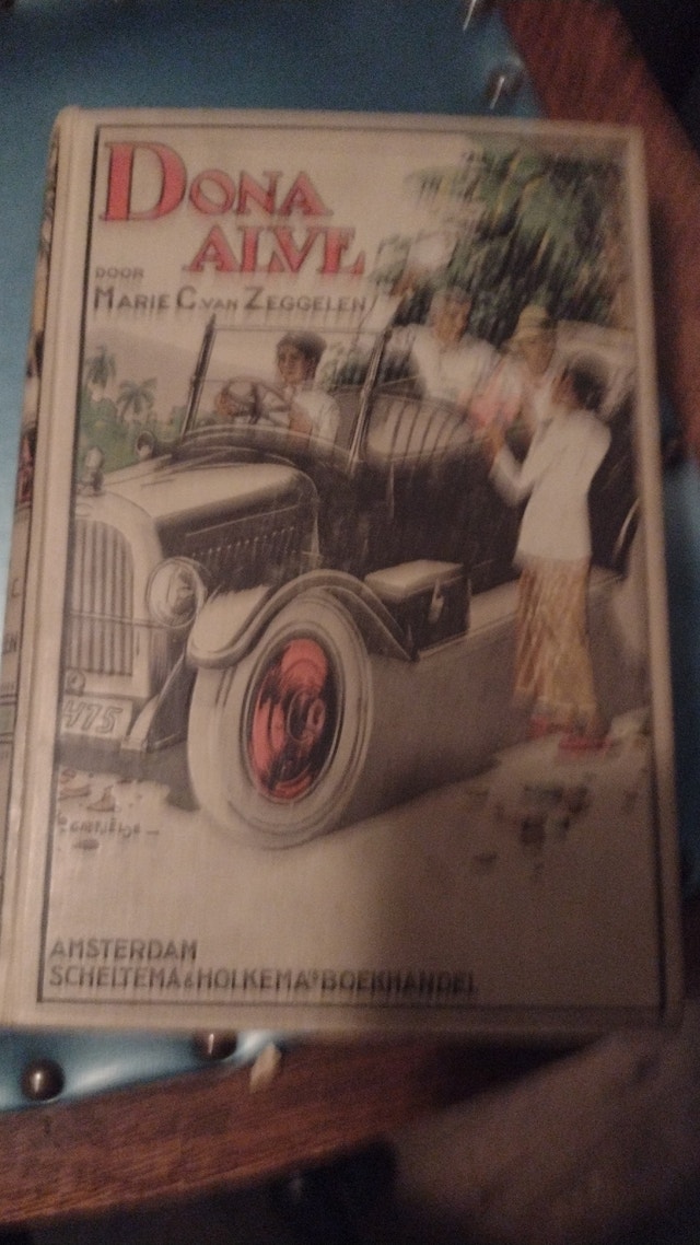 A Dutch book, possibly written in 1929 and likely fiction. It has tight bindings. These books are being donated to the Rexall store on King St West in Oshawa around March 15th. They will be sold for a charity that supports children's education and advocacy. The sale runs from late March until May.