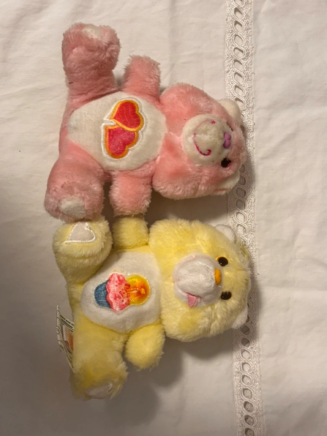 A pair of plush Care Bears toys, one pink and one yellow. The pink bear has two hearts on its tummy, and the yellow bear has a cupcake design. These soft, cuddly bears are ready for a new home!