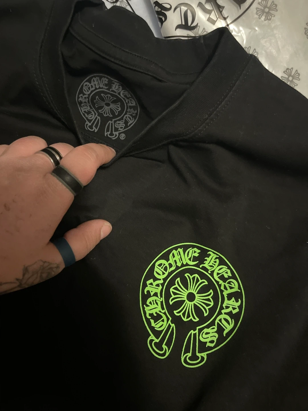 Chrome hearts black crew tshirt with electric green front horse shoe logo and back logo bigger with leather cross in it!! Size medium all