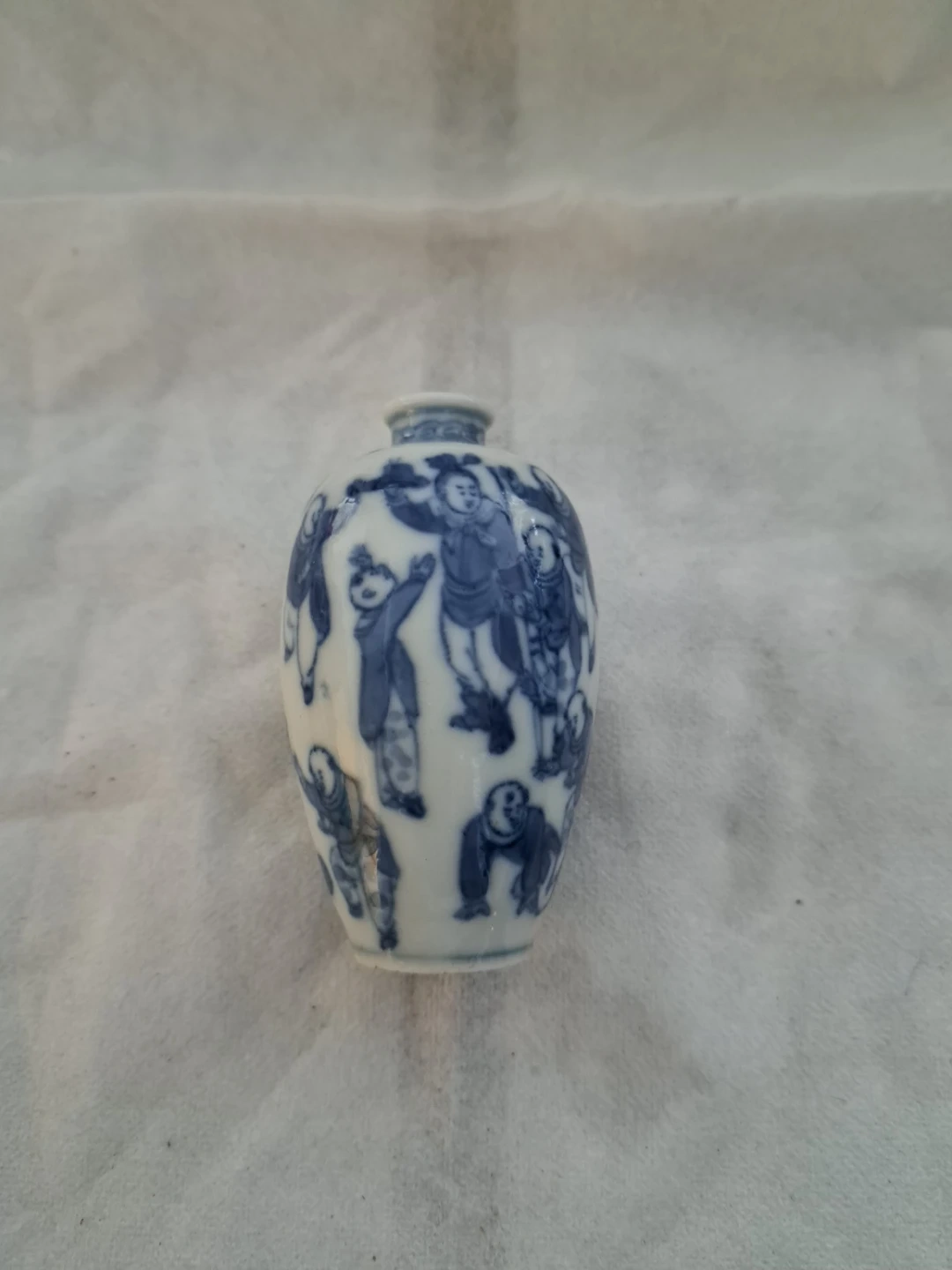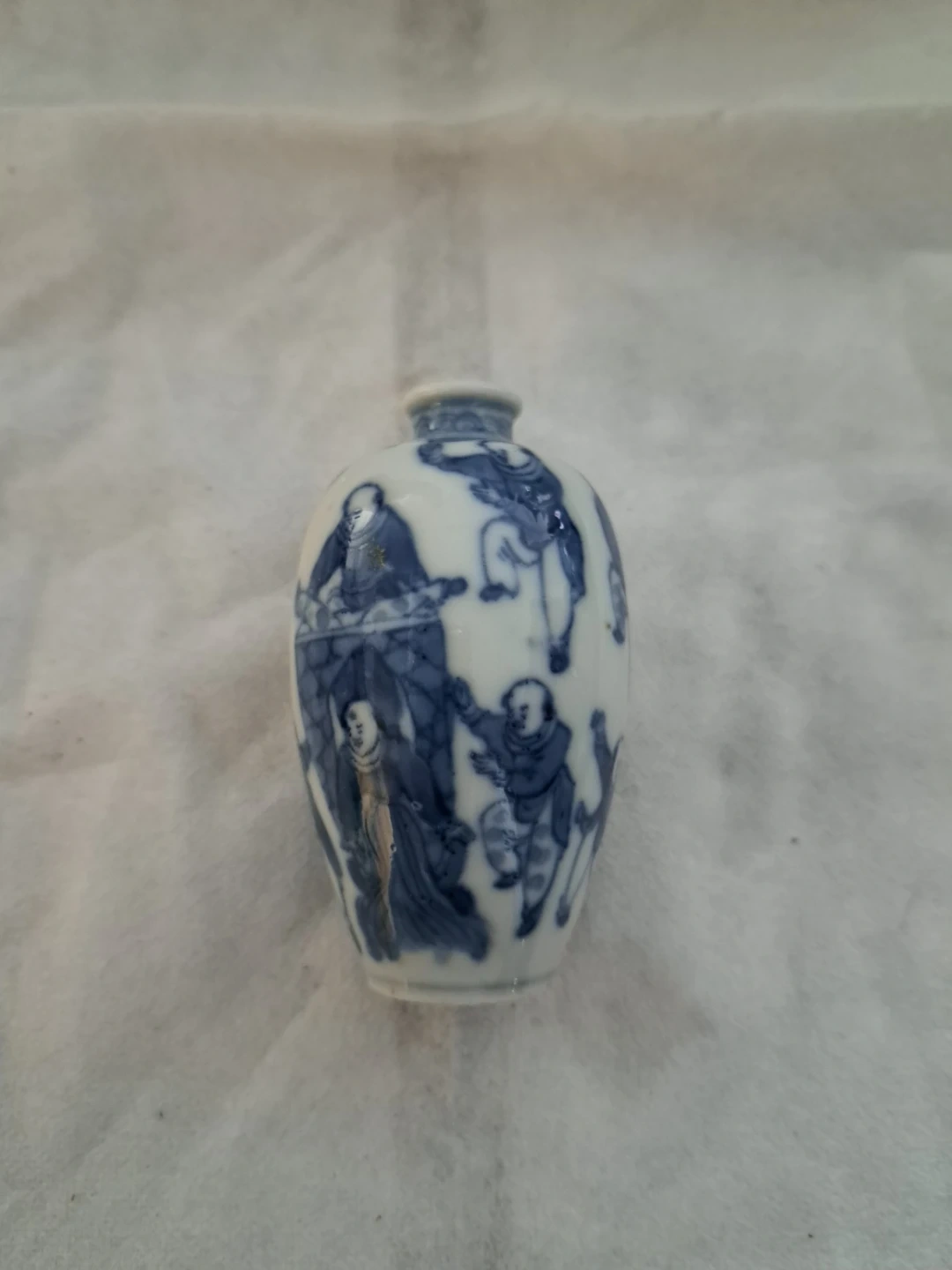 Anique - This is a blue and white porcelain snuff bottle decorated with figures. It's ceramic material. This item would be a nice addition to a collection.