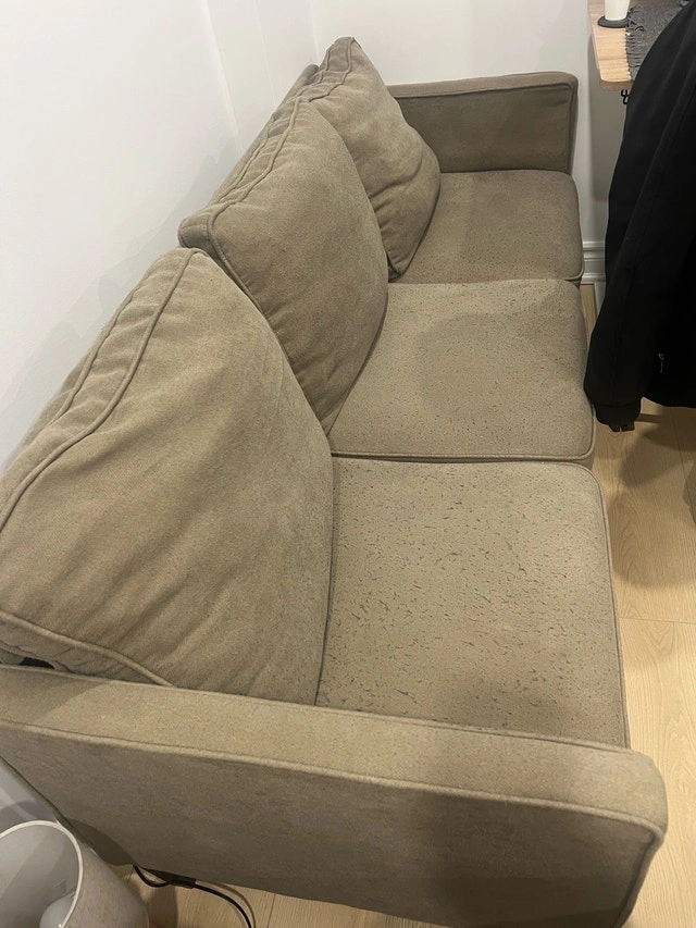 This is a lightweight three-seater couch, perfect for a living room or den, that offers ample seating space and a comfortable design. Please note that the couch is in fair condition and shows visible signs of wear, which is reflected in its price. 72 inches wide. Cash accepted.