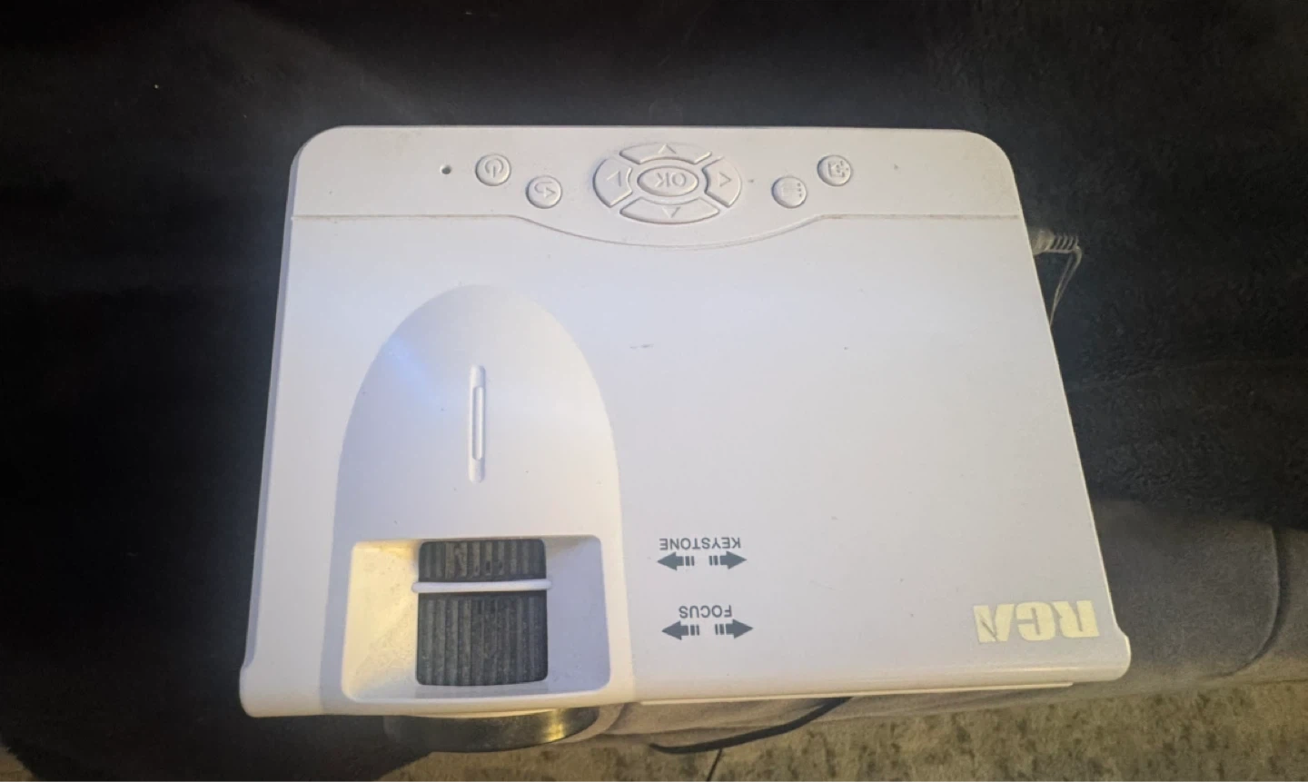 This RCA Bluetooth Home Theater Projector is white. It has keystone and focus adjustment wheels. This projector can be used for home entertainment. Never used