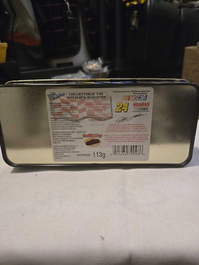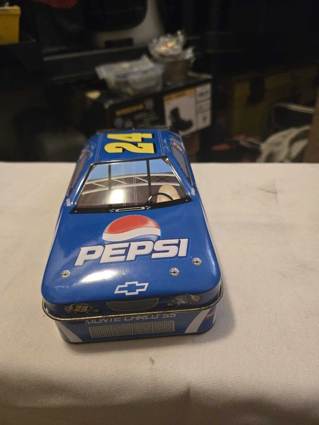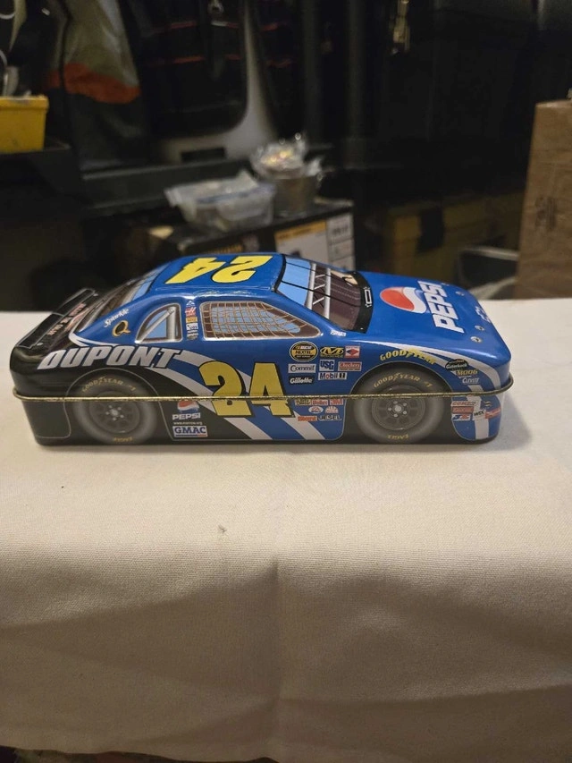 I'm selling a used Jeff Gordon #24 Nascar Collectible Tin. It is in good condition, with some minor wear and tear. This tin is a great item for any Nascar or Jeff Gordon fan, perfect for storing small items or displaying as a collectible. It's always a good time for a trip down memory lane! If the ad's still up, the tin is still up for grabs!