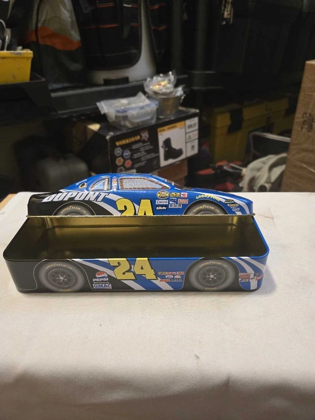 I'm selling a used Jeff Gordon #24 Nascar Collectible Tin. It is in good condition, with some minor wear and tear. This tin is a great item for any Nascar or Jeff Gordon fan, perfect for storing small items or displaying as a collectible. It's always a good time for a trip down memory lane! If the ad's still up, the tin is still up for grabs!