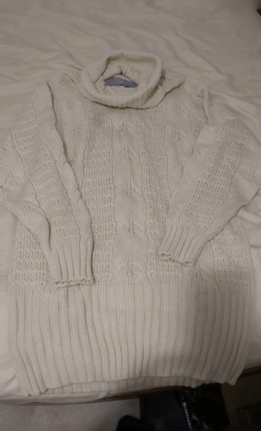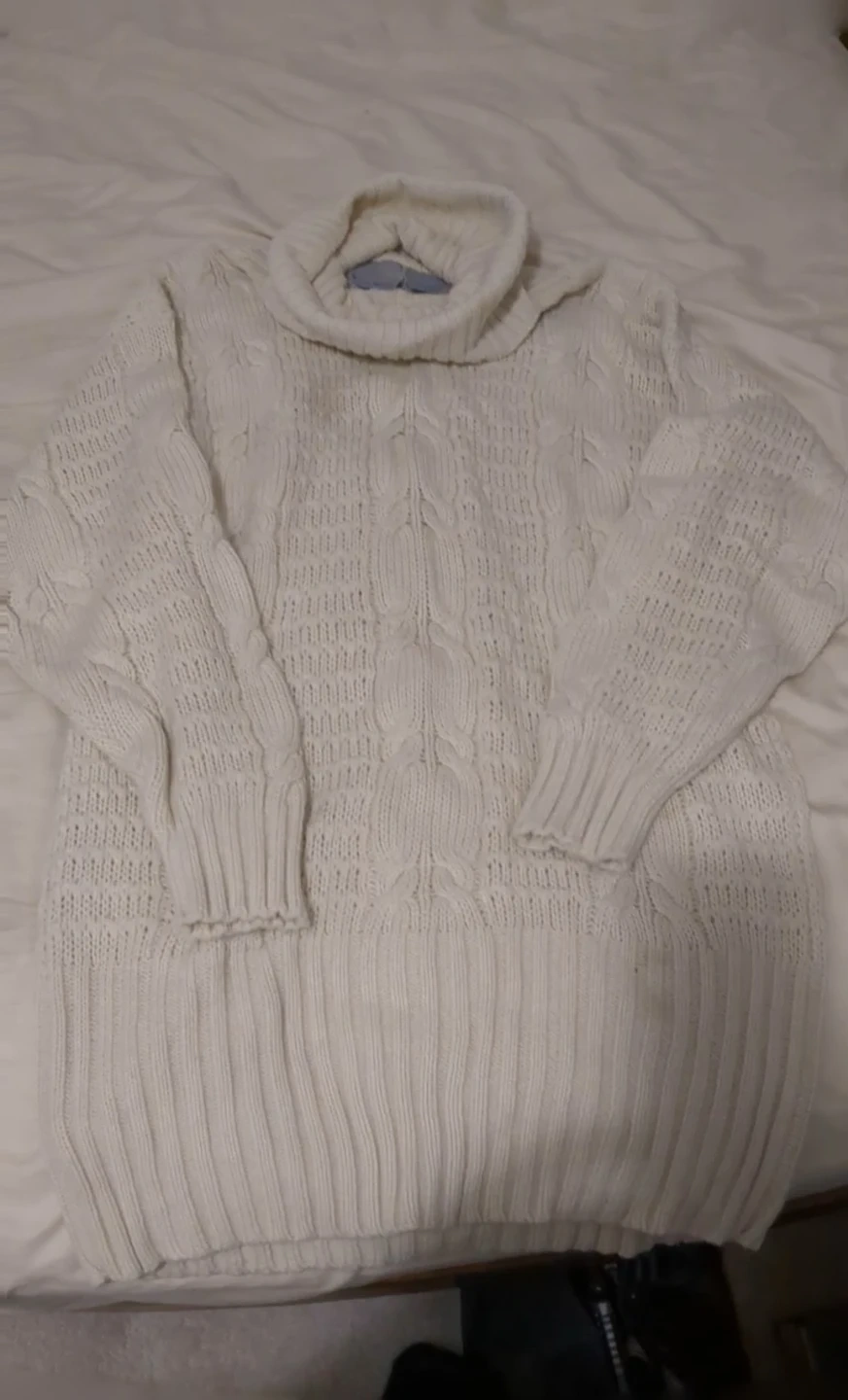 Cozy cream-coloured turtleneck sweater with a lovely cable knit design! Perfect for staying warm and stylish during the cooler months. It's in great condition and ready for a new home in your wardrobe