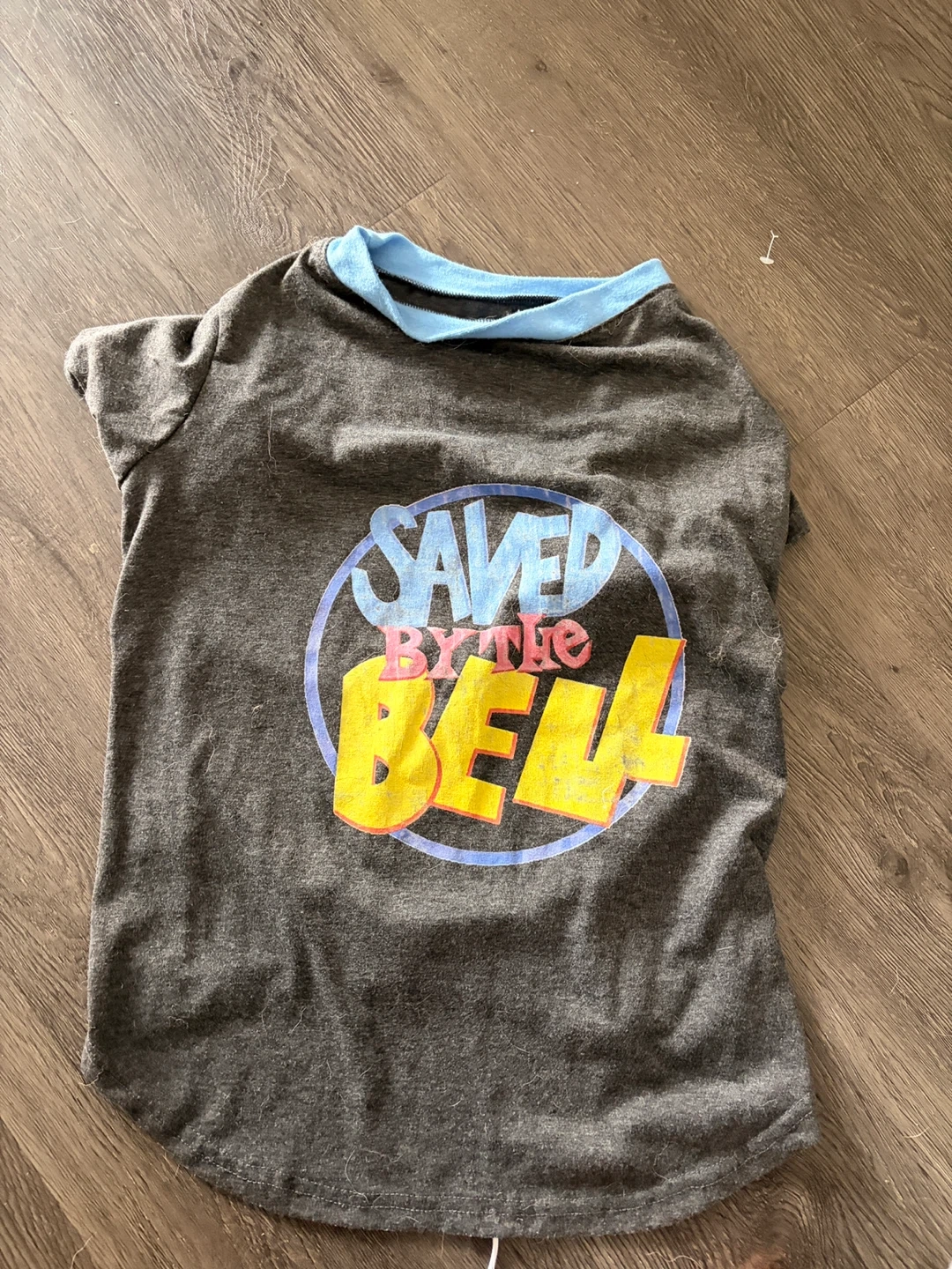 Grey t-shirt featuring the iconic Saved By The Bell logo. It's a fun piece for fans of the classic show. The collar is a light blue colour.