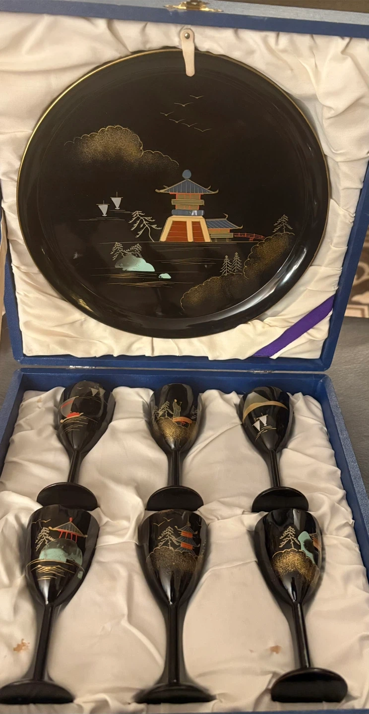 This set includes a decorative Japanese lacquered serving tray and six cordial glasses. Each piece is adorned with intricate hand-painted Asian-inspired scenes, featuring pagodas, boats, and scenic landscapes in gold and coloured accents on a black finish. They're perfect for serving small drinks or as unique display pieces.