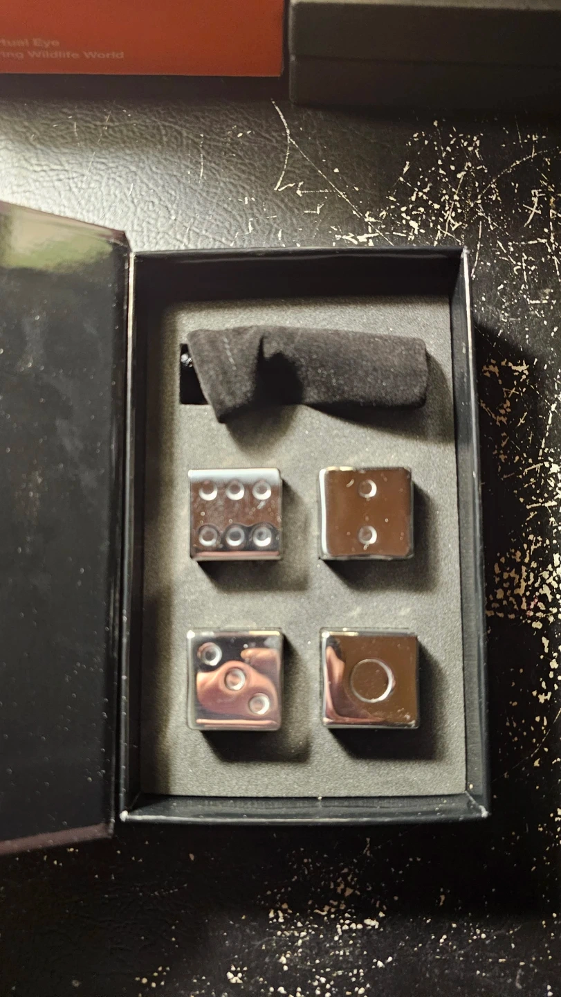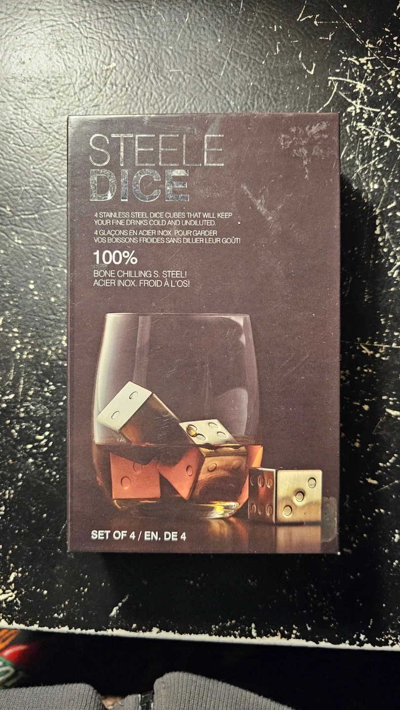 Selling a new set of 4 stainless steel whiskey dice-shaped ice cube stones. In box with suede bag.