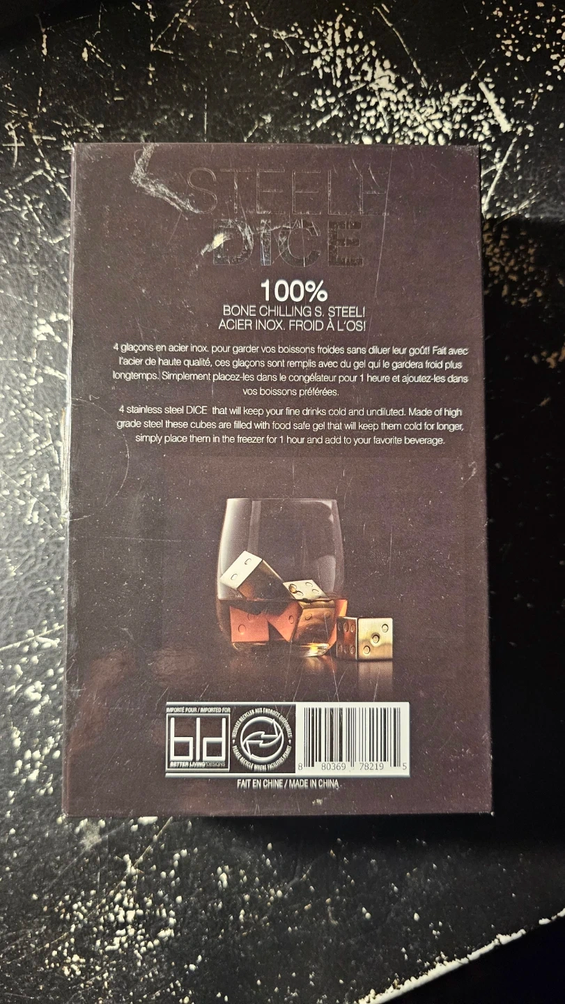 Selling a new set of 4 stainless steel whiskey dice-shaped ice cube stones. In box with suede bag.