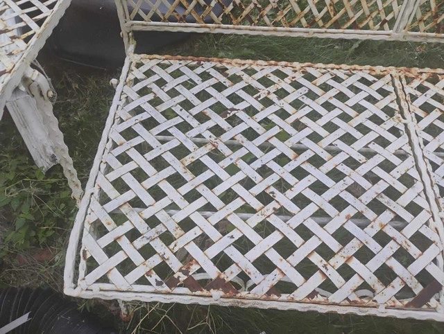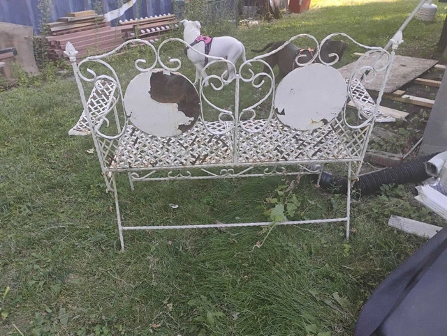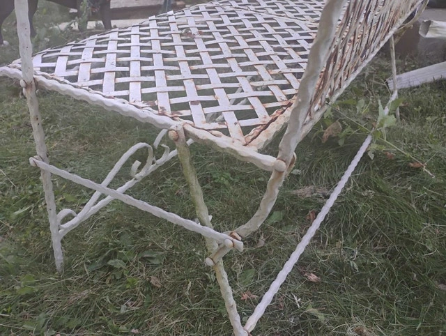 Rare Vintage French Country White Wrought Iron Tiled Bench w Parrots Two Seateral and a tile mosaic Folding ASKING $400 PICK UP ON BEAVERBROOK LANE KANATA THANK YOU A bit if rust but can easily be restored Gorgeous Bench in Great Vintage Condition. Solid and Firm. Wear is usual for its age. Please see photos. Overall a Gorgeous Bench that you will love having in your home!! Measurements: 35"High x 44"W x 21"x SH 16" Please keep in mind that this is a Vintage Piece and has its normal signs of wear. This is what gives it it's character and confirms its age. Note: Please use photos as part of the description. If you have any questions please feel free TO ASK thank you