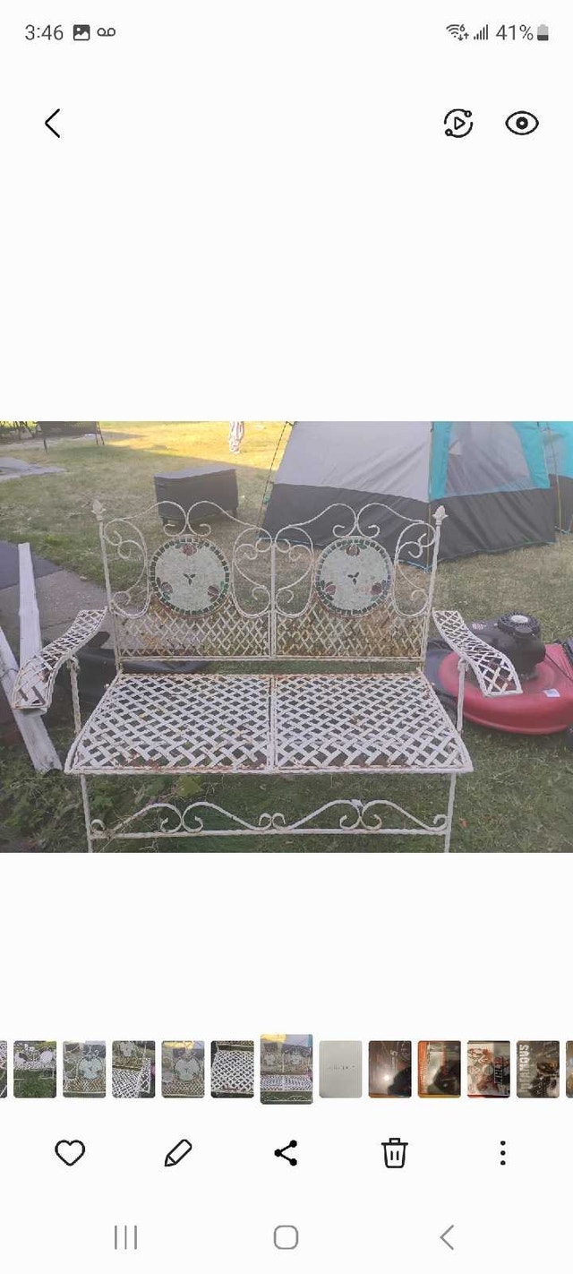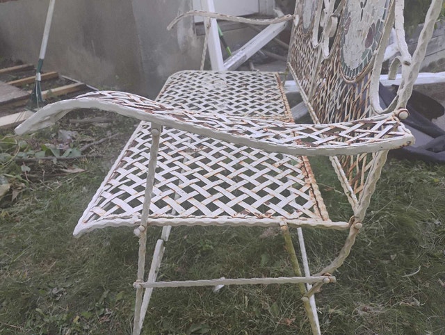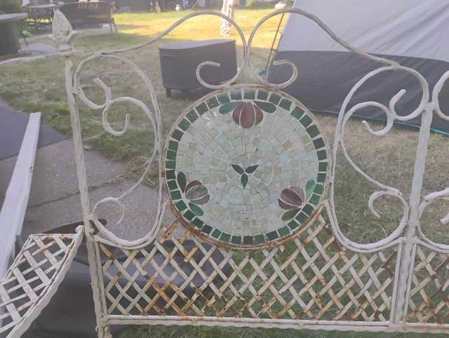 Rare Vintage French Country White Wrought Iron Tiled Bench w Parrots Two Seateral and a tile mosaic Folding ASKING $400 PICK UP ON BEAVERBROOK LANE KANATA THANK YOU A bit if rust but can easily be restored Gorgeous Bench in Great Vintage Condition. Solid and Firm. Wear is usual for its age. Please see photos. Overall a Gorgeous Bench that you will love having in your home!! Measurements: 35"High x 44"W x 21"x SH 16" Please keep in mind that this is a Vintage Piece and has its normal signs of wear. This is what gives it it's character and confirms its age. Note: Please use photos as part of the description. If you have any questions please feel free TO ASK thank you