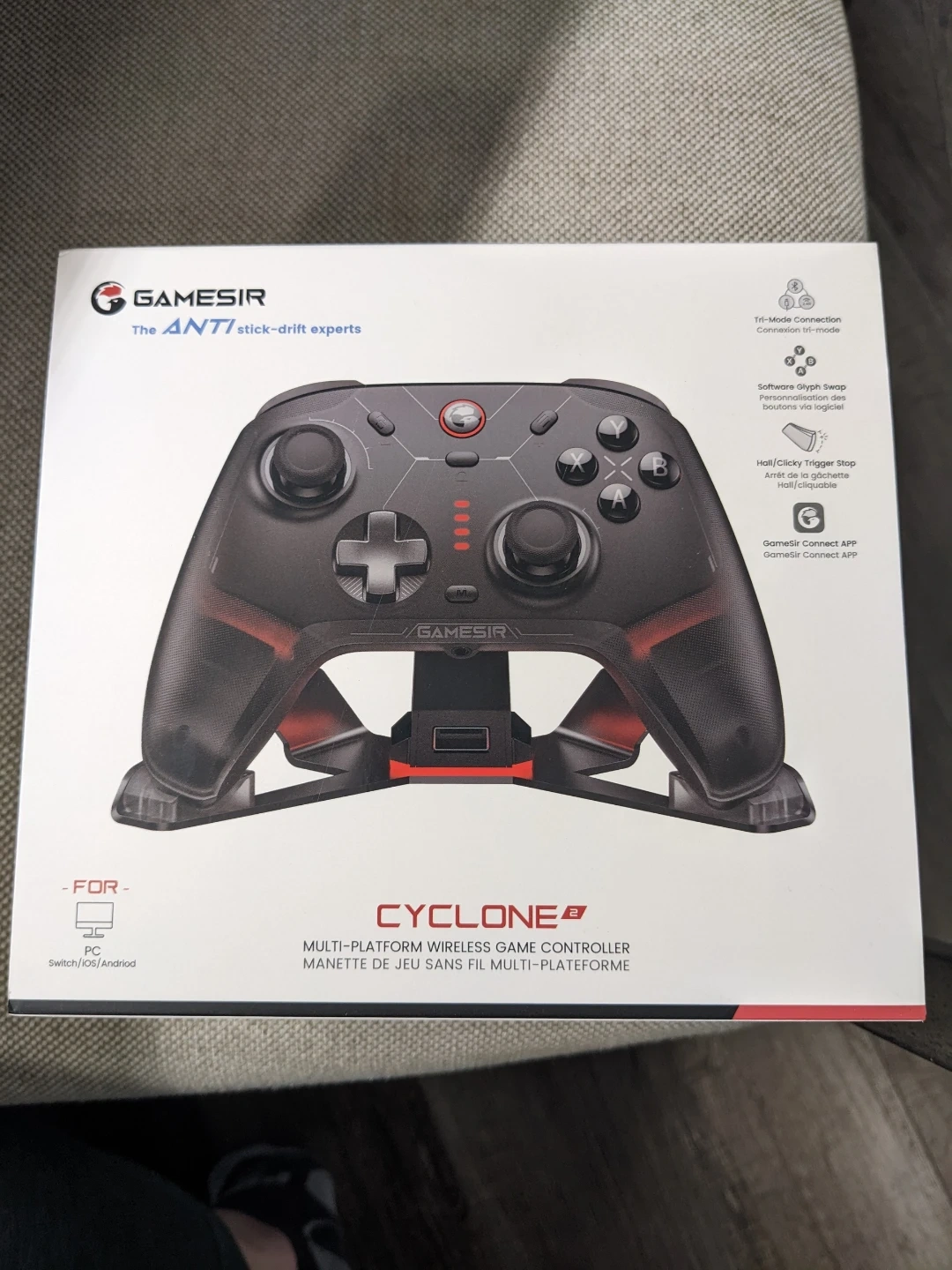This GameSir Cyclone 2 is a multi-platform wireless game controller. It features tactile buttons, adjustable grips and 2.4GHz wireless connectivity. Charging dock included. It's compatible with PC, Switch, iOS and Android. Brand new in box.
