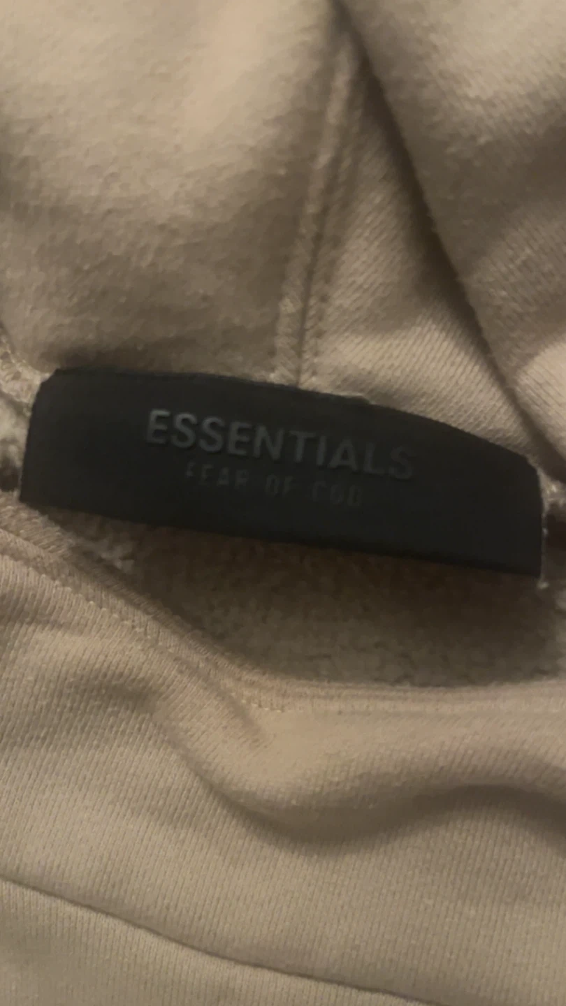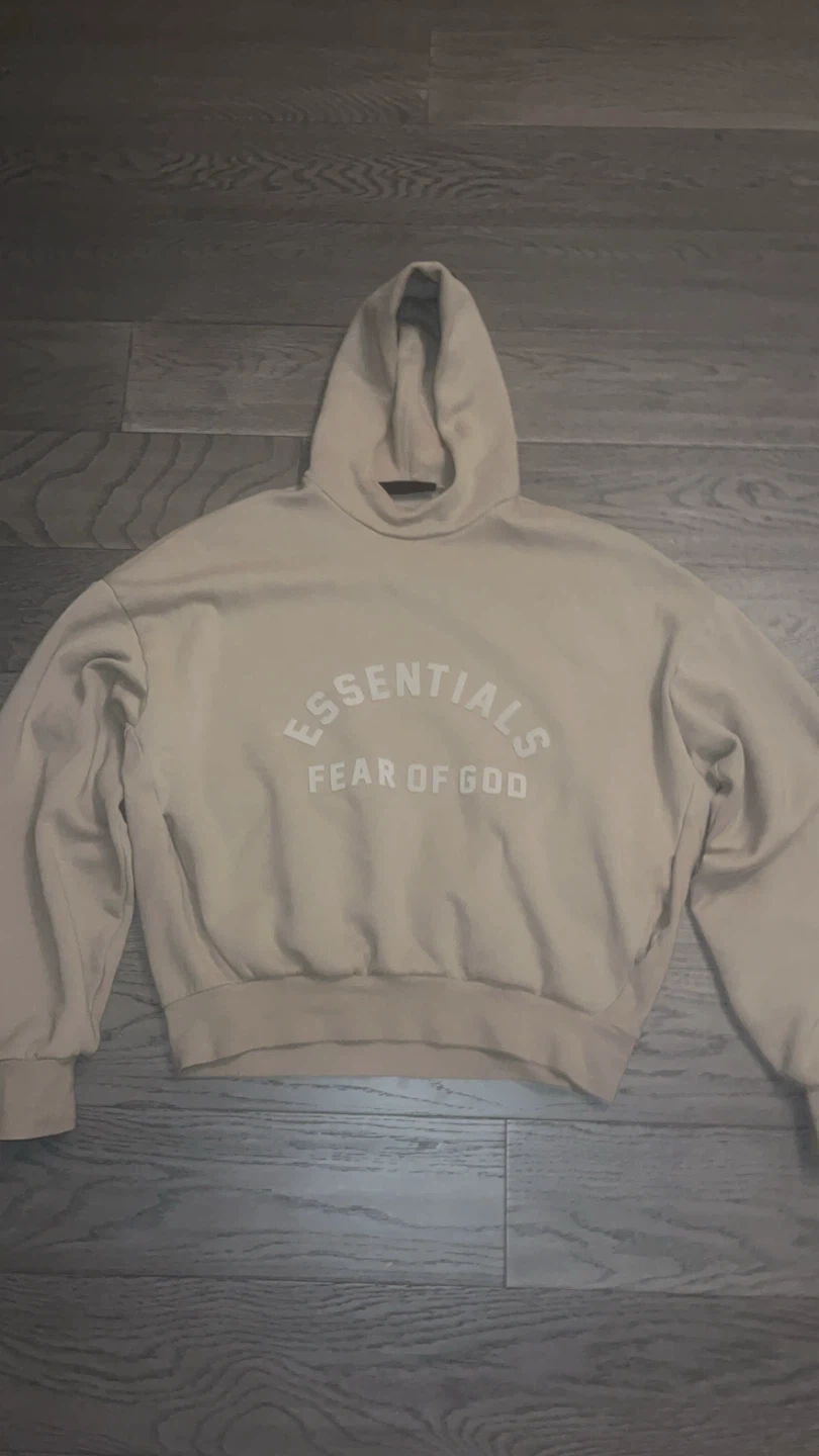 This is a beige/tan essentials fog hoodie pretty sure size L can fit an M very well. 60$ can do delivery but will cost extra. Great quality.