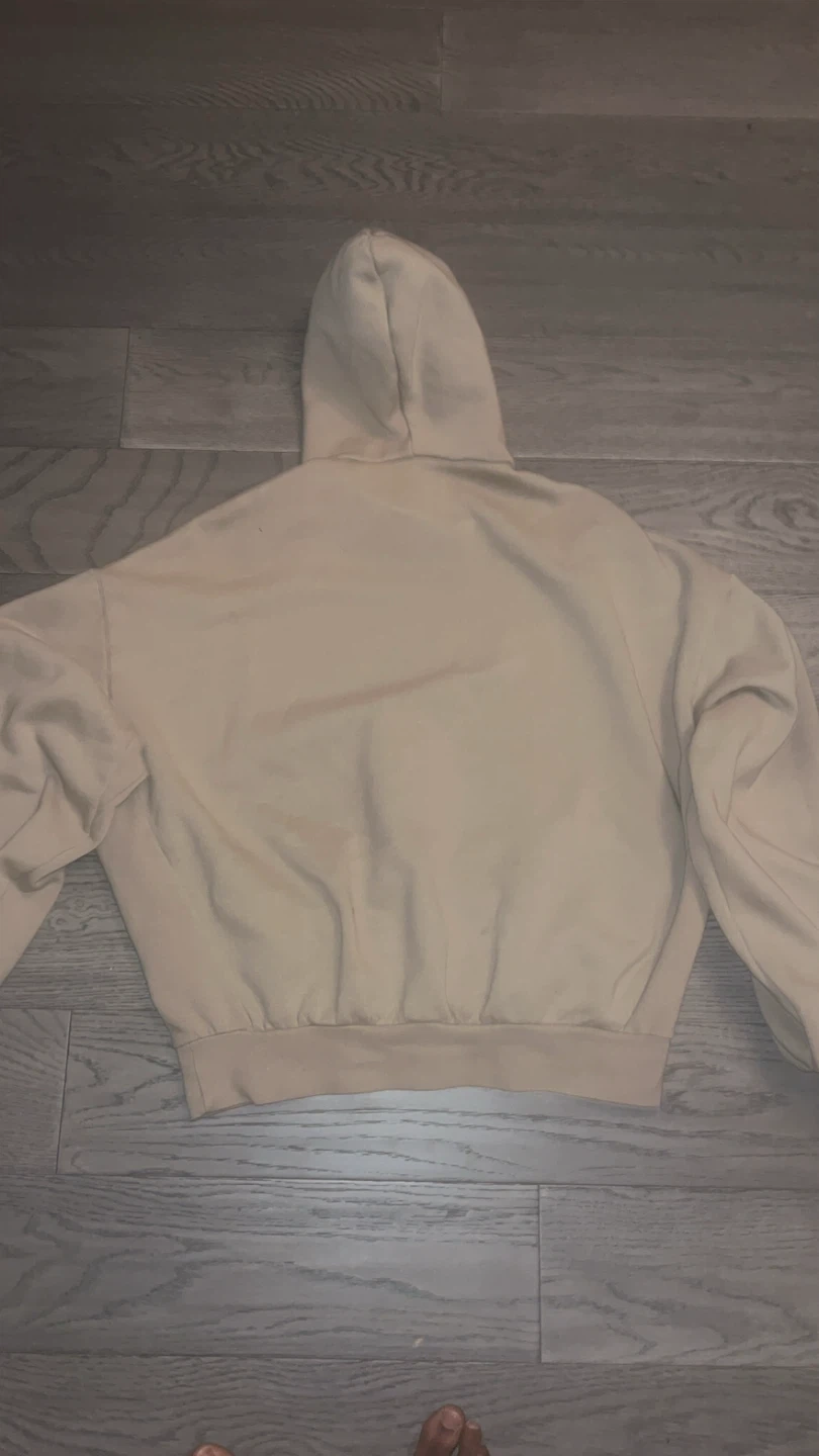 This is a beige/tan essentials fog hoodie pretty sure size L can fit an M very well. 60$ can do delivery but will cost extra. Great quality.
