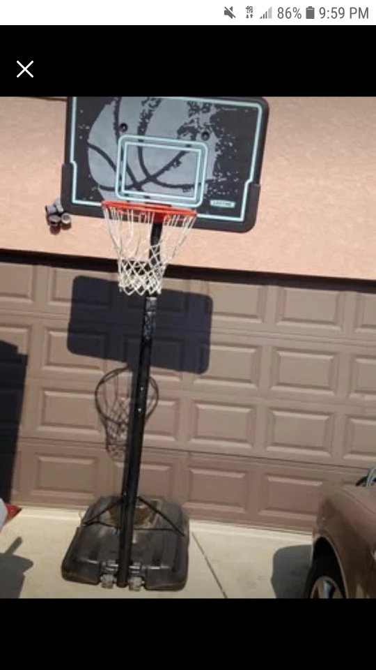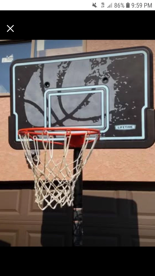 This is a portable basketball hoop with a Lifetime brand backboard. It has a sturdy base for stability. Great for practicing your game!Good shape just needs a bolt in nut on bottom of plastic and underneath net check pictures