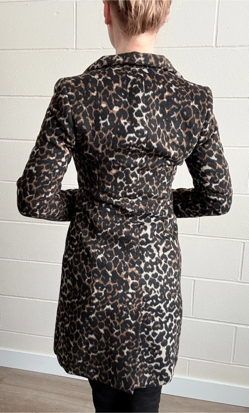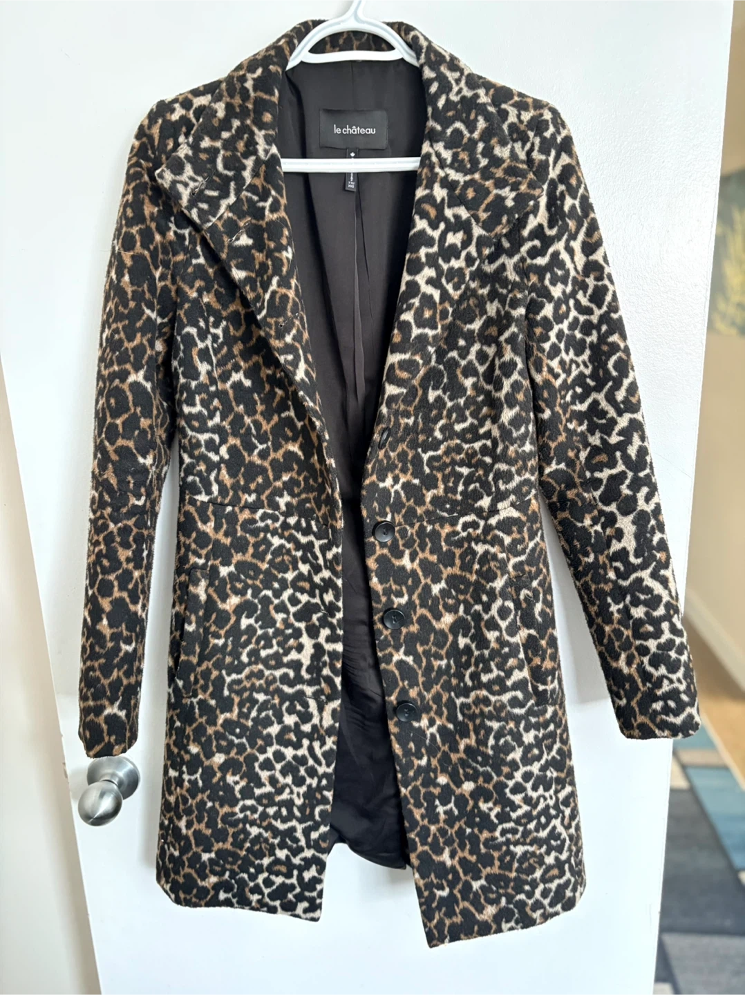 Le Chateau coat featuring a stylish leopard print pattern! Perfect for adding a touch of flair to your wardrobe.