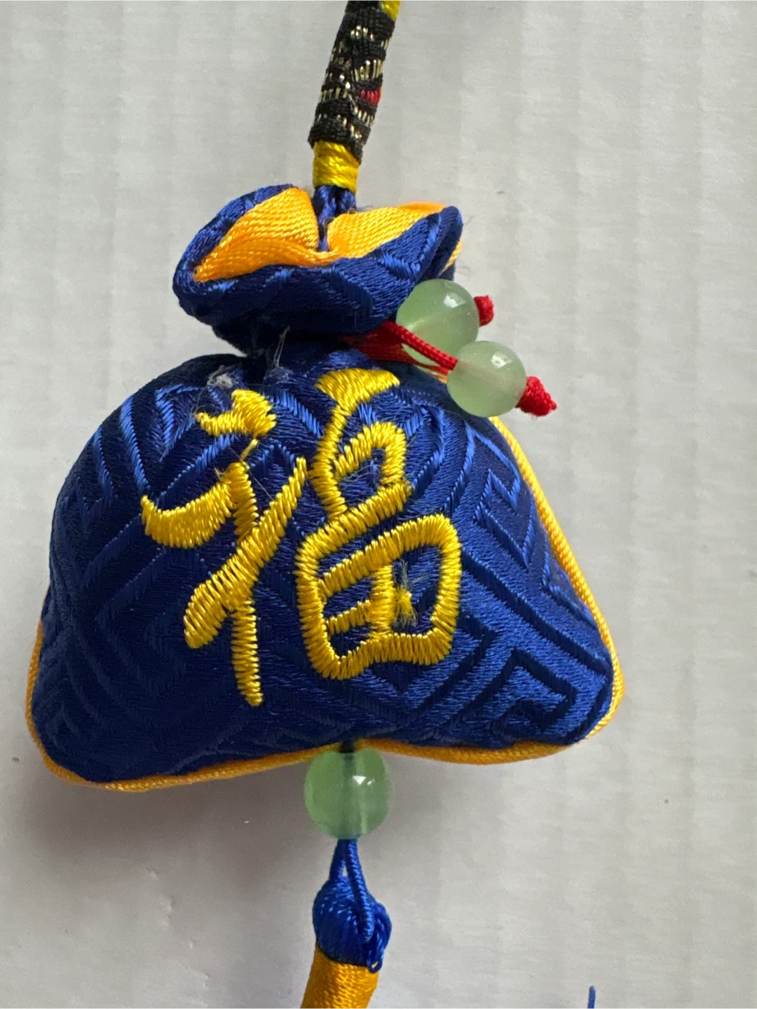 This is a blue fabric lucky bag charm with yellow embroidery. It features a tassel and green jade-like beads. It's a decorative piece with a traditional design.