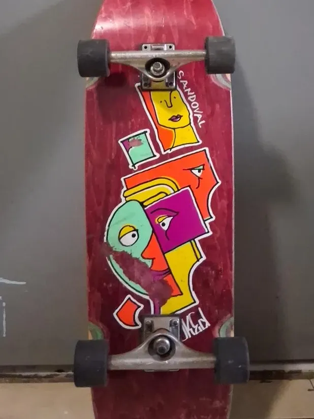 This is a Sandoval skateboard deck featuring unique abstract face art. The deck has a red finish and comes with silver trucks and black wheels.