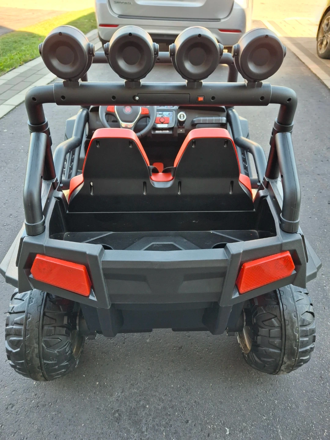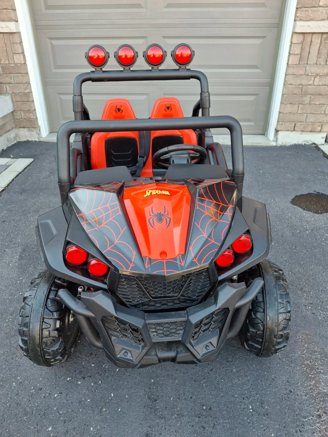 This Spider-Man ride-on toy car features a dual-seat design and a vibrant red and black colour scheme with web accents. It has a sturdy build with large off-road wheels and a roll bar with headlights. Includes seat belts for safety. Great for outdoor adventures!